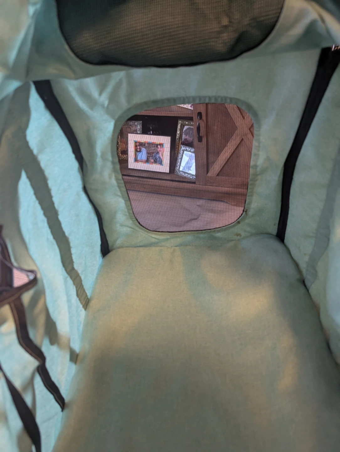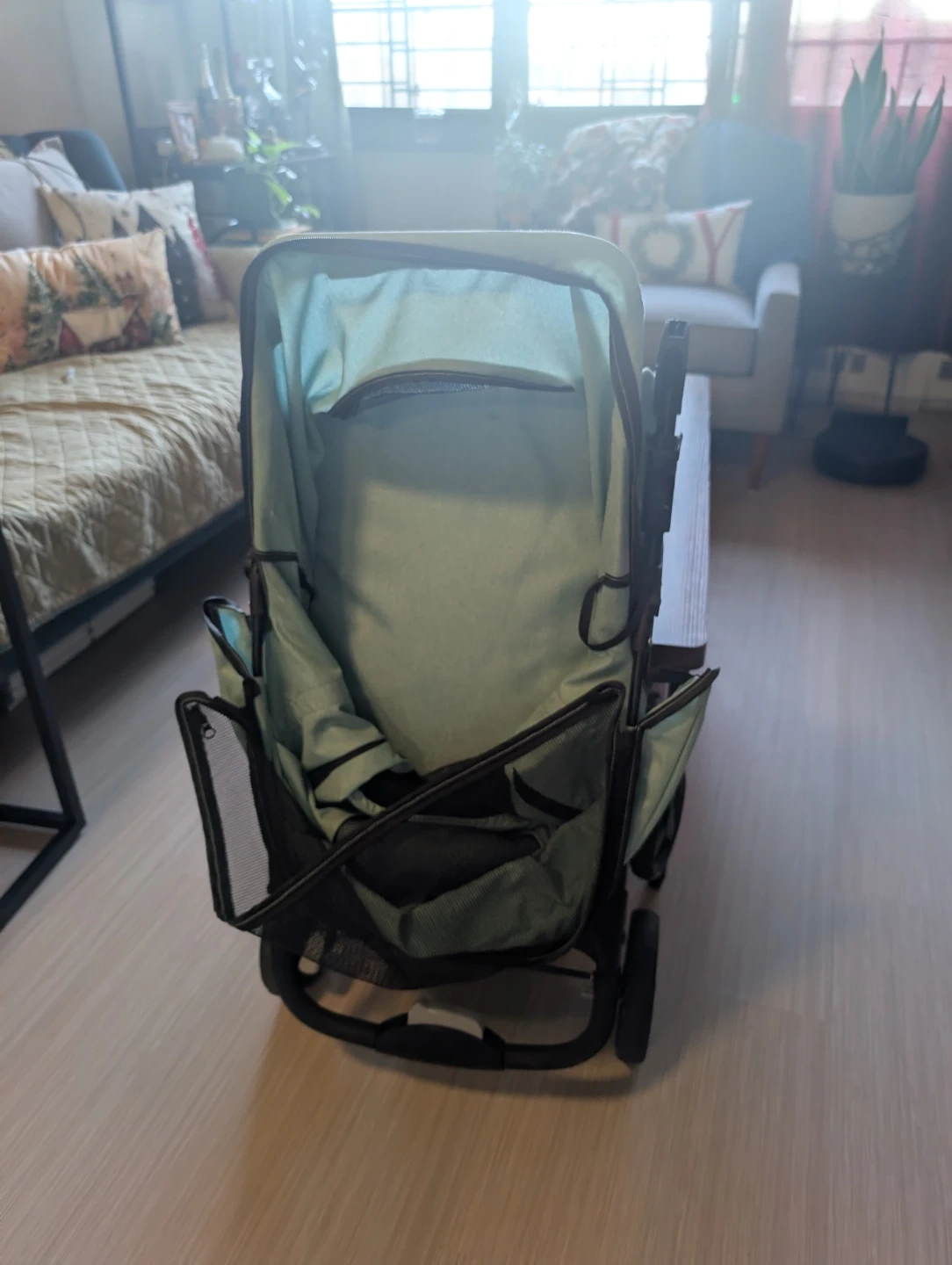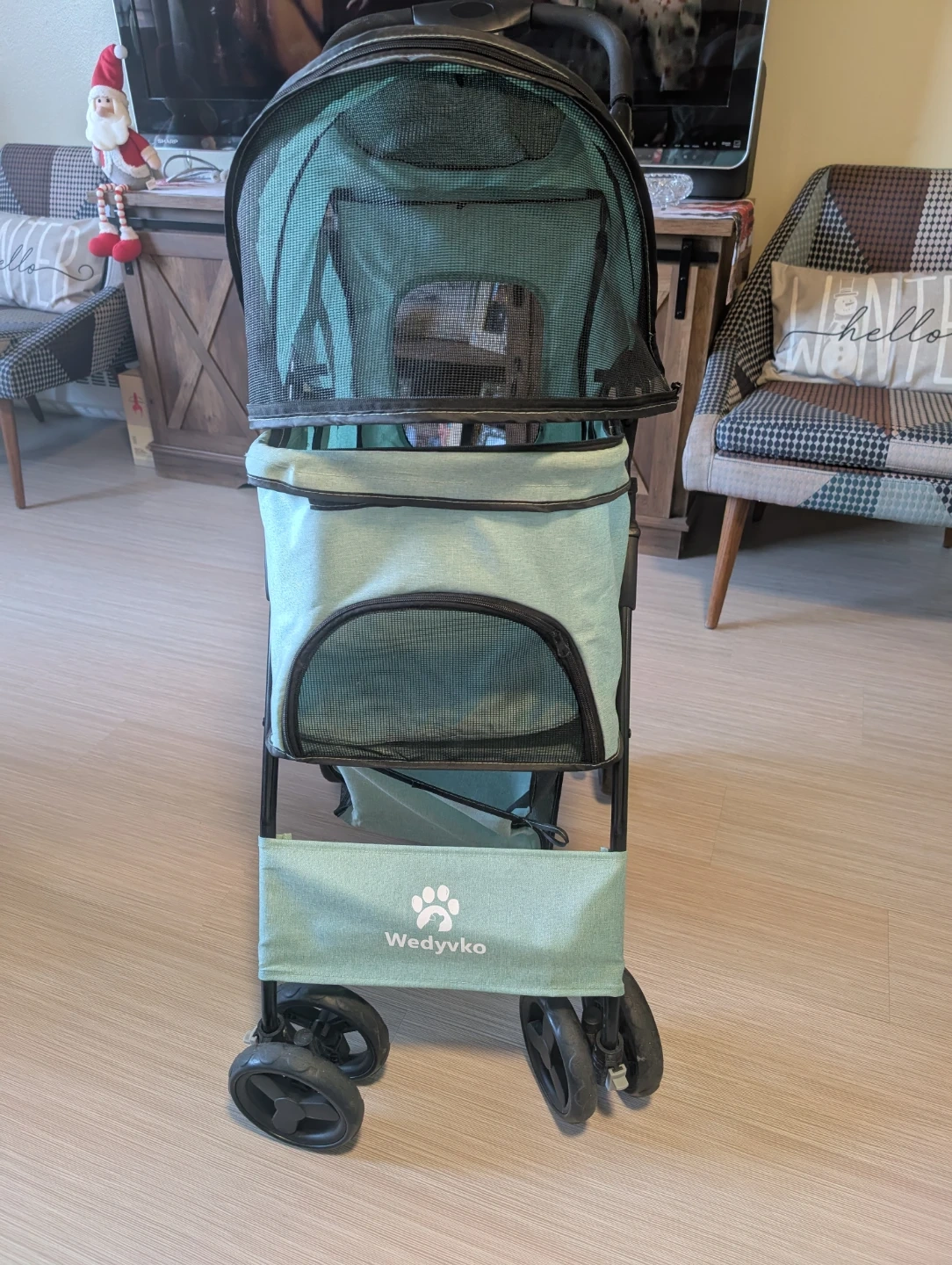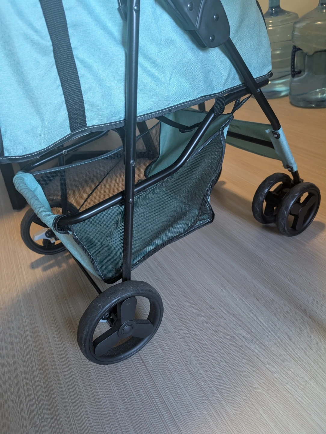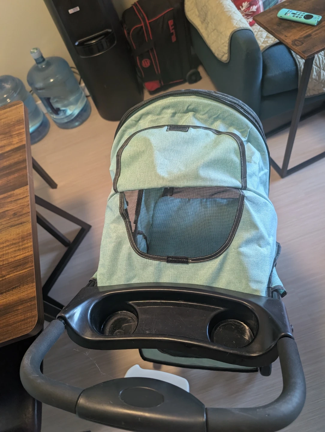 Selling a pet stroller in great condition! It's a lovely mint green color and looks like it's ready for some walks in the park. Perfect for your furry friend! For a small pet up to 30 lbs.