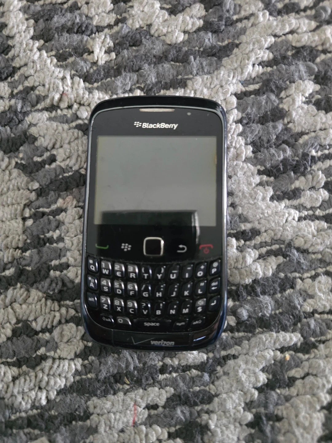 Selling a used BlackBerry cell phone. It's a classic phone with a physical keyboard. It's branded with the Verizon logo.