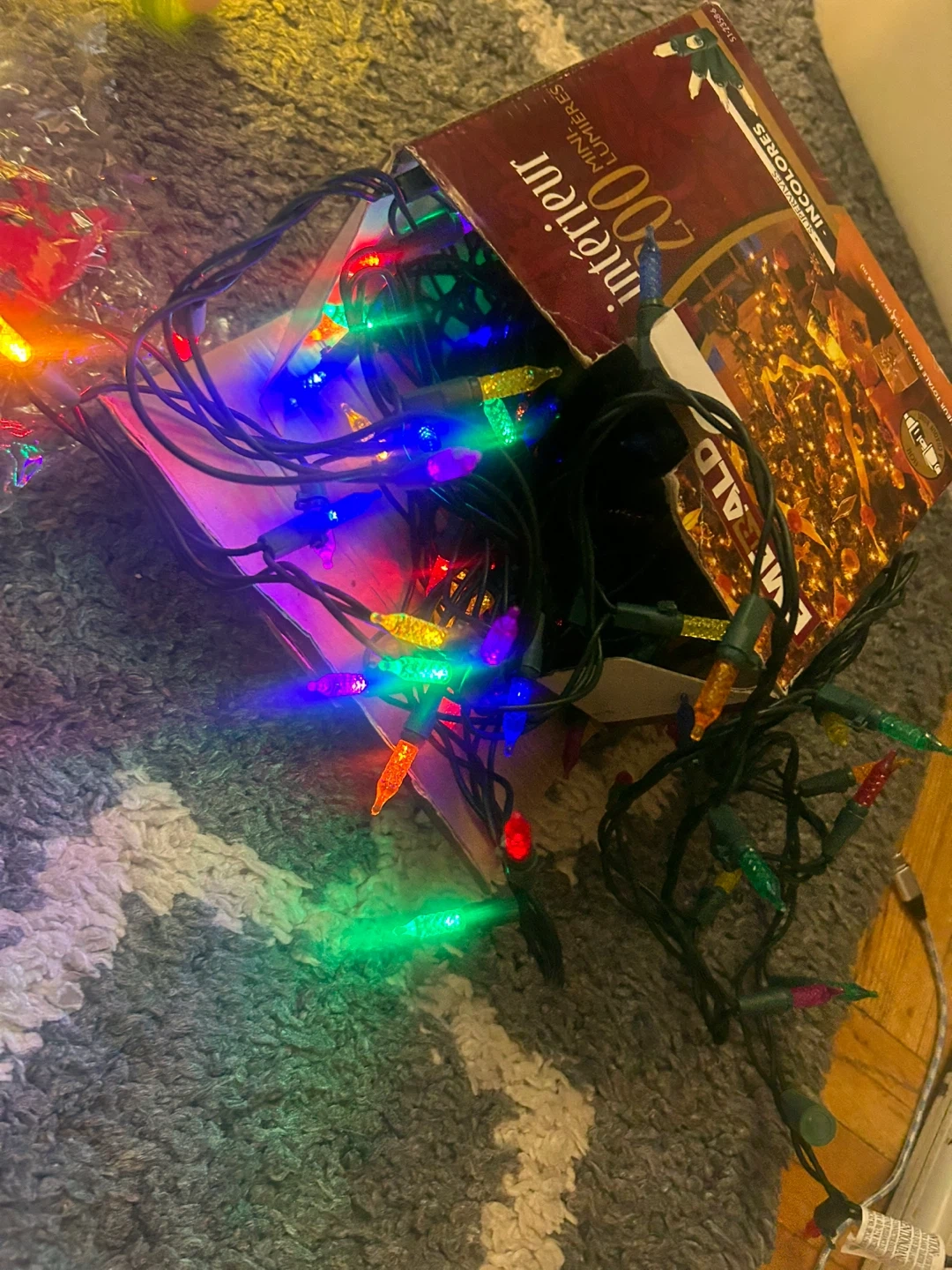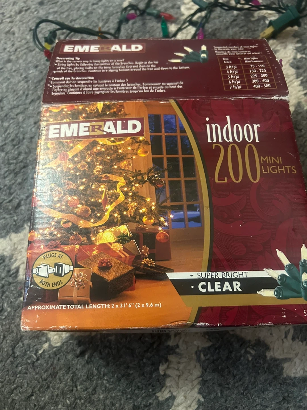 Selling a set of Emerald indoor mini lights! They're the clear, super bright kind and come with 200 lights. The approximate total length is 2 x 31' 6" (2 x 9.6 m). The box is included!