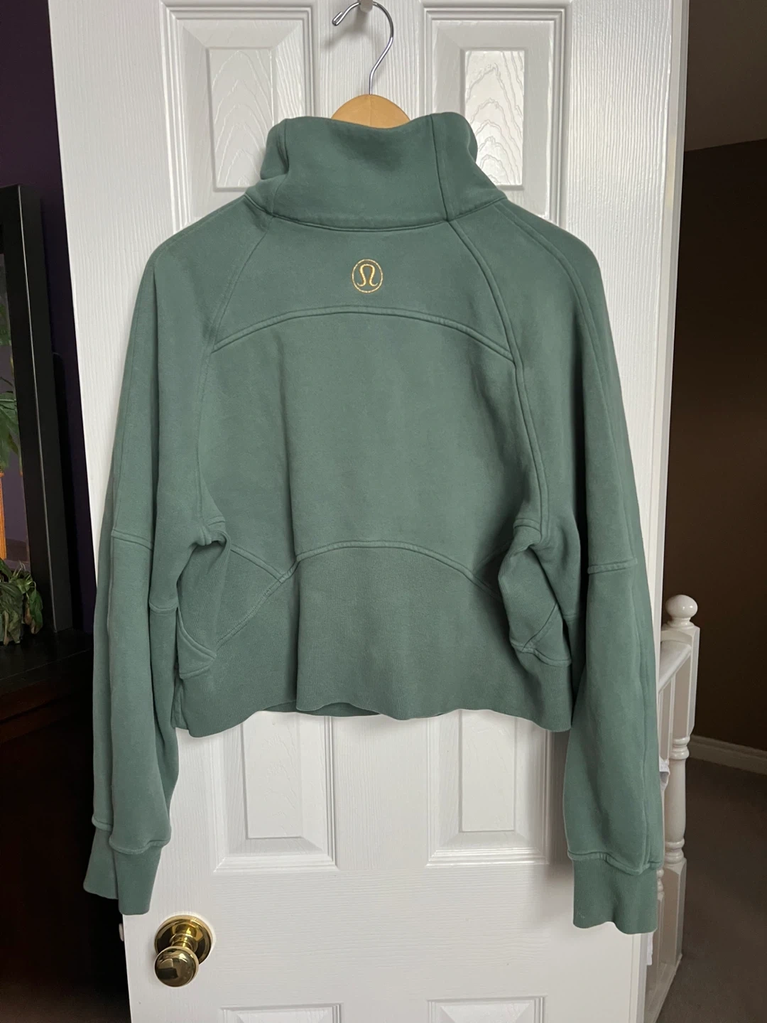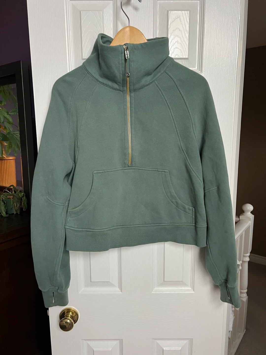 Selling a Lululemon cropped half-zip in a lovely green colour! It's in great condition and a size M/L. Perfect for layering or wearing on its own. A stylish and comfy addition to your wardrobe!
