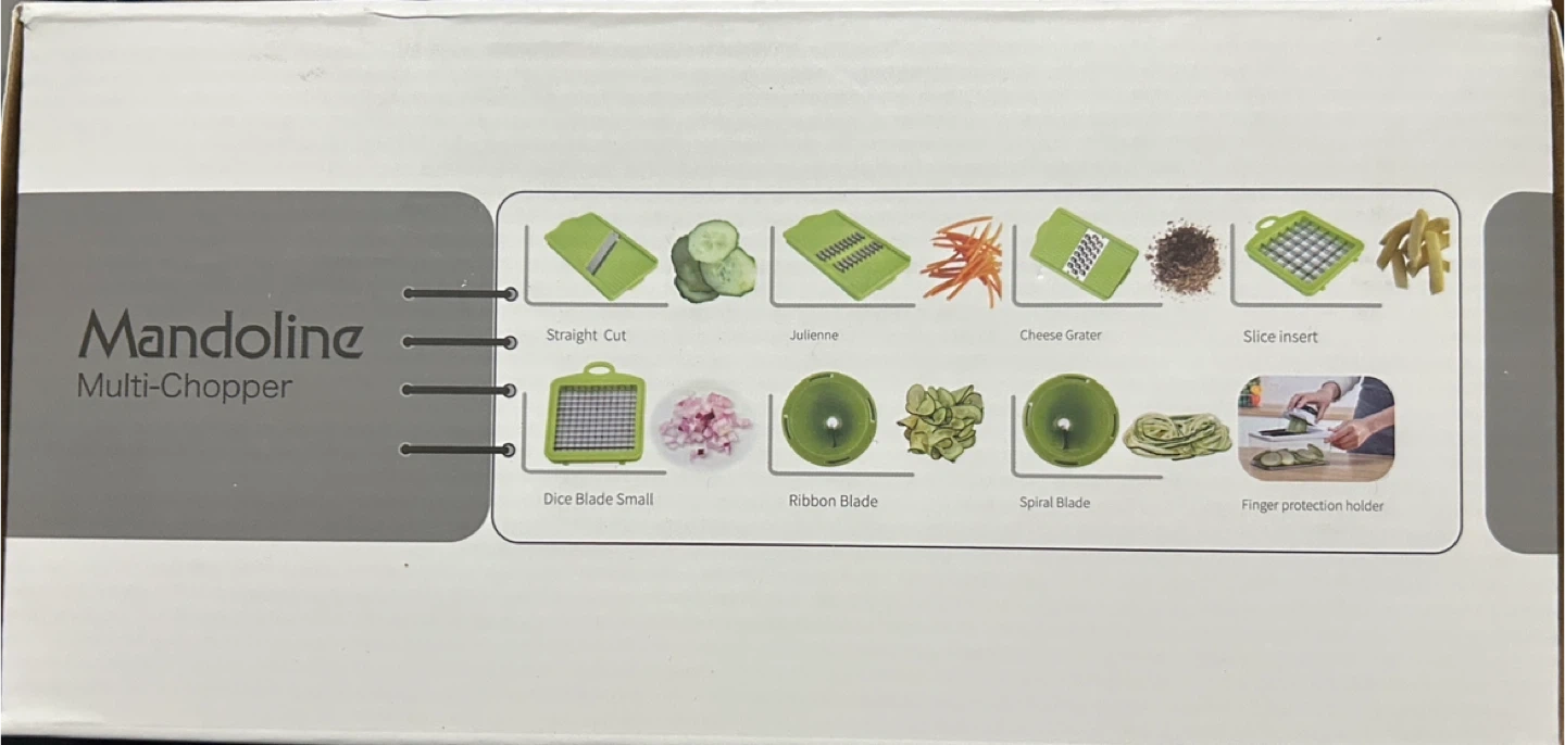 Brand new HOBFU Mandoline Multi-Chopper! A great gadget that simplifies food preparation! The set includes 7 different stainless steel blades for straight cuts, julienne, cheese grating, slice inserts, dice blade small, ribbon blade, spiral blade. Comes with 1.2L container, 2 cleaning tools and a finger protection holder. Great for gifts.