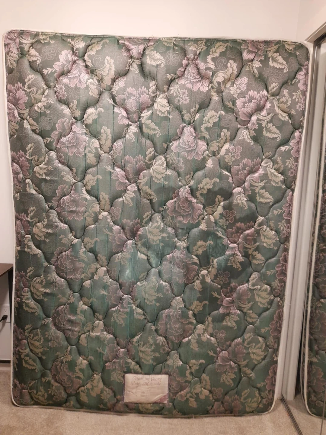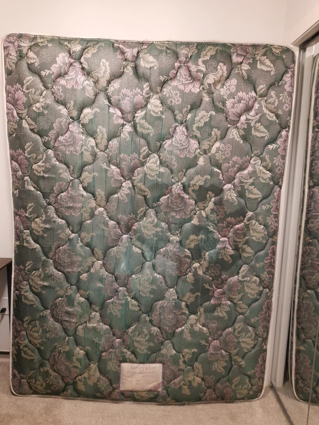 Selling a mattress with a floral pattern and a queen box. The mattress have a stain and a tear, the box is great condition. Pet free smoke free. Free delivery