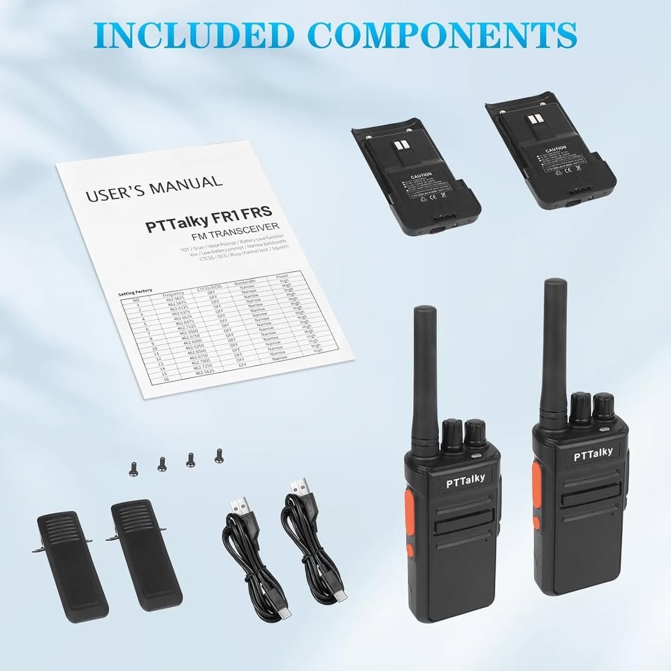 【Package includes】2 x FR1 long range walkie talkies ,2 x 1200mAh Li-ion Battery Pack ,2 x USB-C cable, 2 x Belt Clip,1 x English Manual .