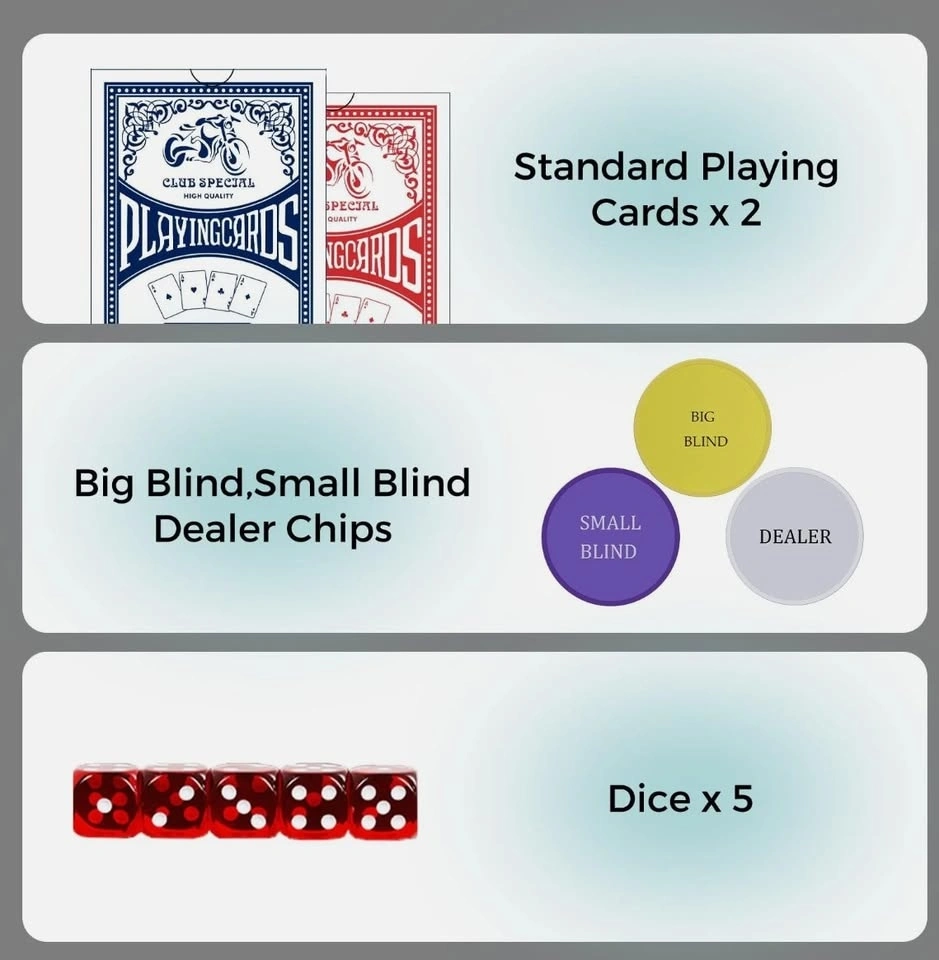 This Poker Set includes 200 full Sized 11.5g weighted, 1.5" diameter, 1/8" thick Vegas-style Chips, 2 deck of cards, 1 dealer button, 2 betting buttons, 5 Poker dice.