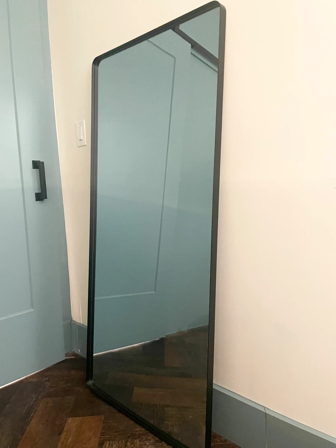 Selling a Amarho black frame mirror . It's in great condition and ready to brighten up your space! The sleek black frame adds a modern touch to any room. Perfect for adding depth and style to your home decor.