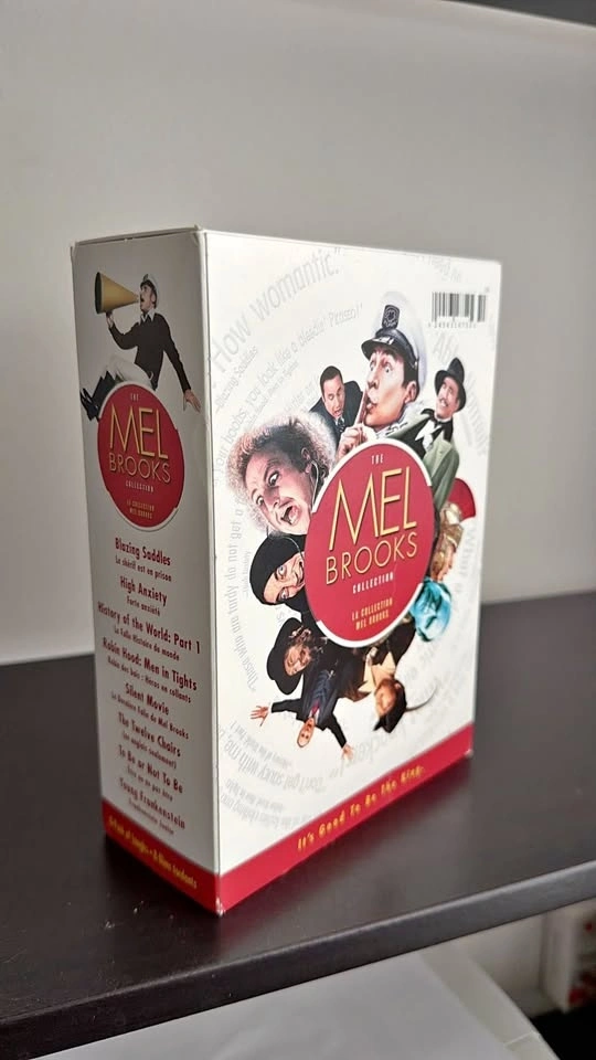 The Mel Brooks Collection 8-film box set featuring classic comedies: Blazing Saddles, High Anxiety, History of the World: Part I, Robin Hood: Men in Tights, Silent Movie, The Twelve Chairs, To Be or Not To Be, and Young Frankenstein. Includes both English and French titles.