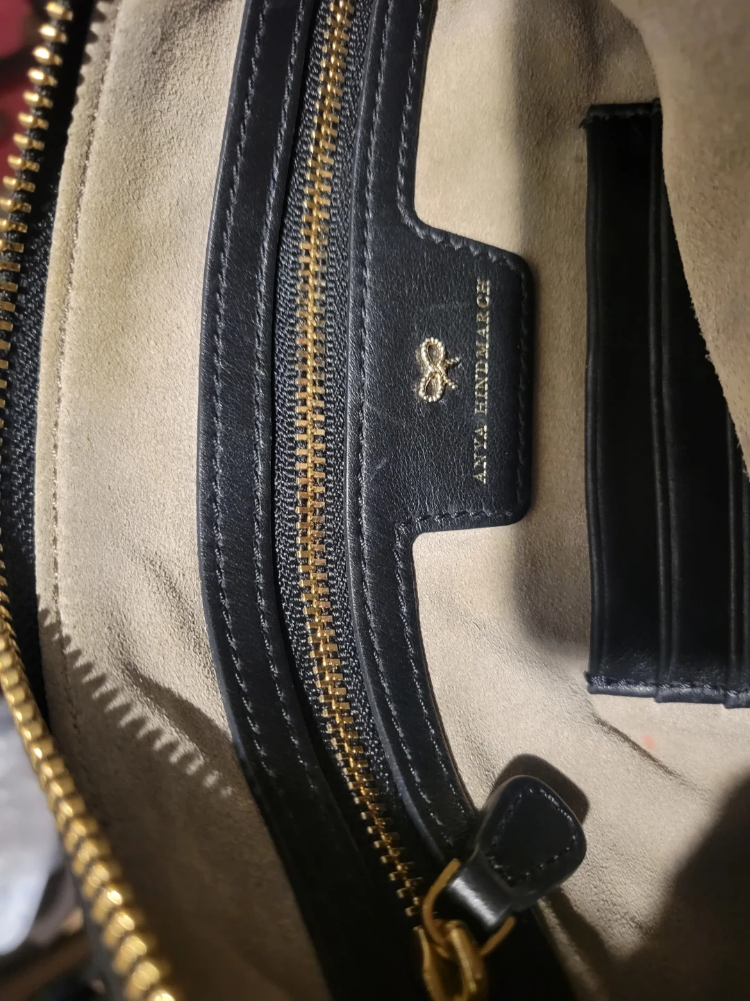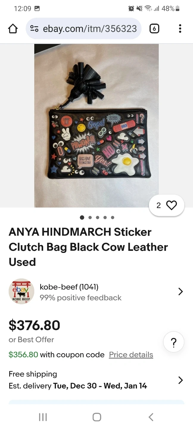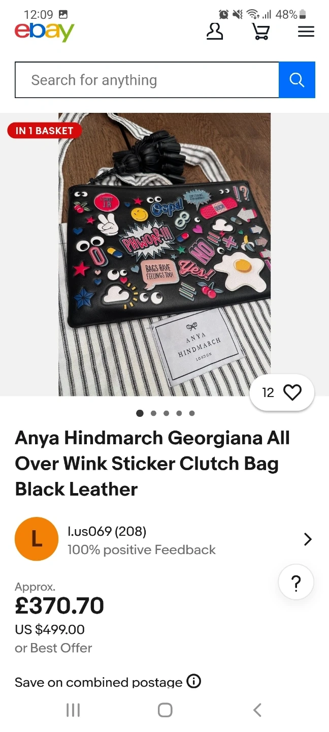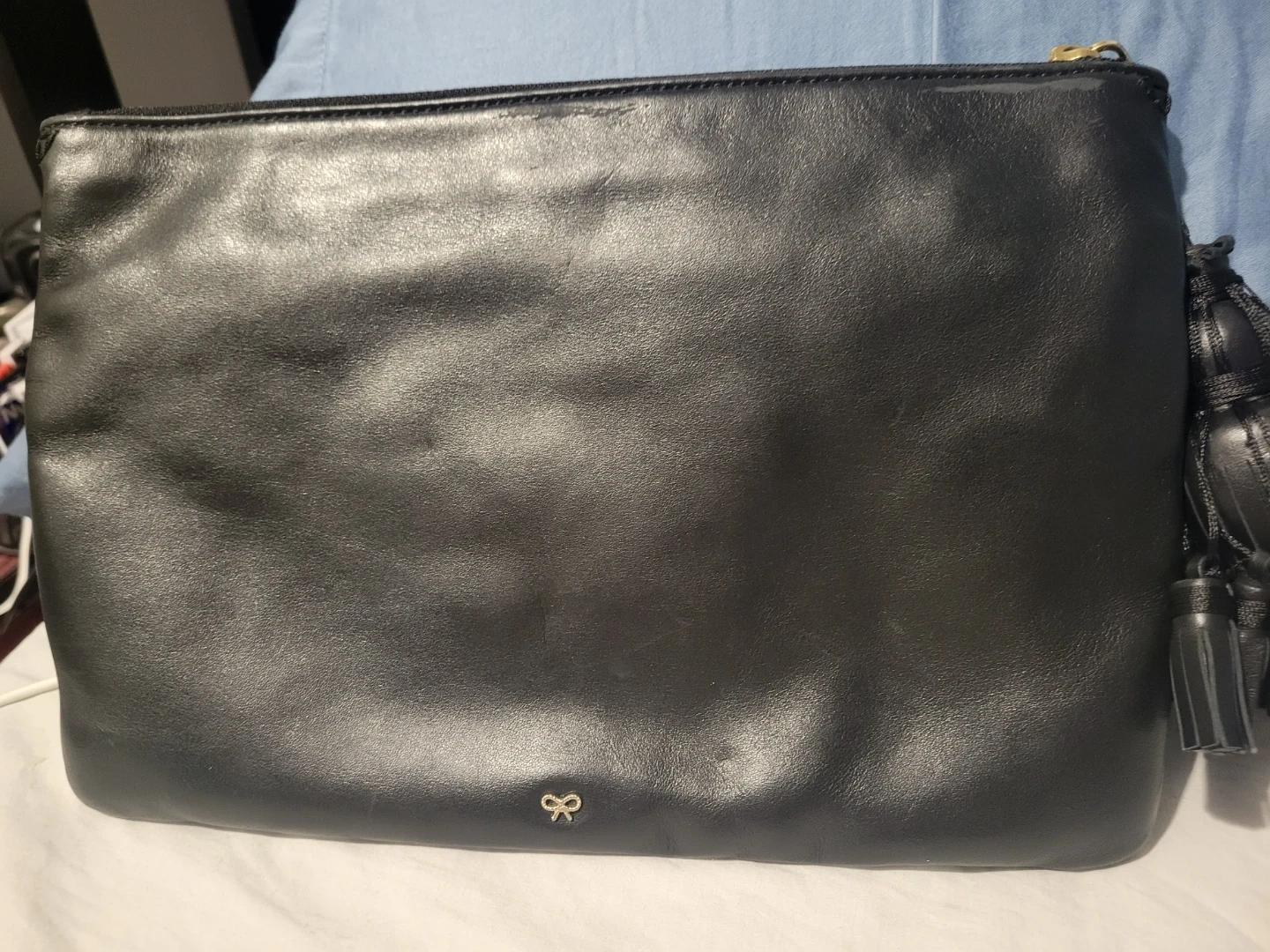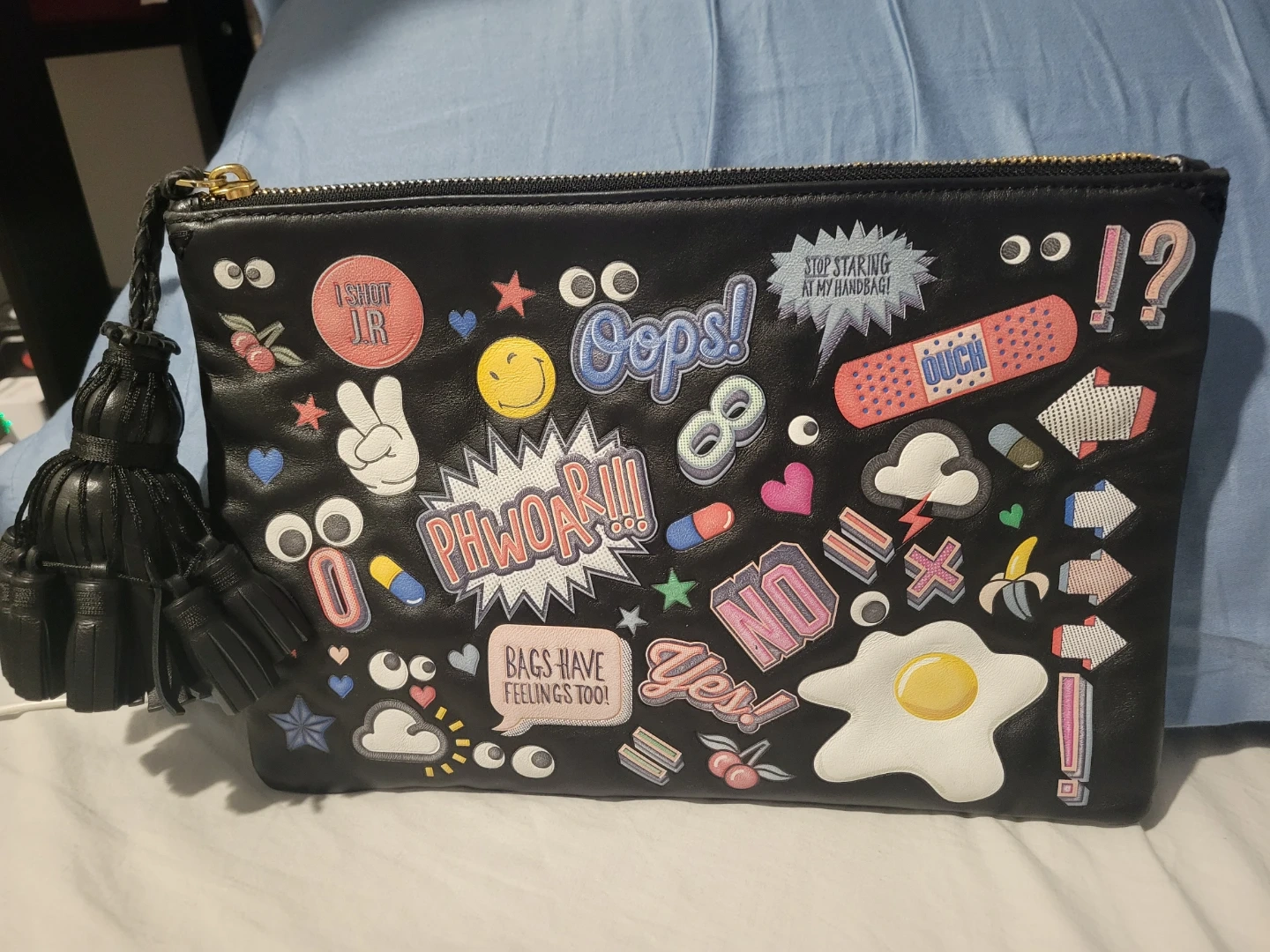 This is an Anya Hindmarch sticker clutch bag in black cow leather. It's a fun and stylish accessory with unique sticker detailing.