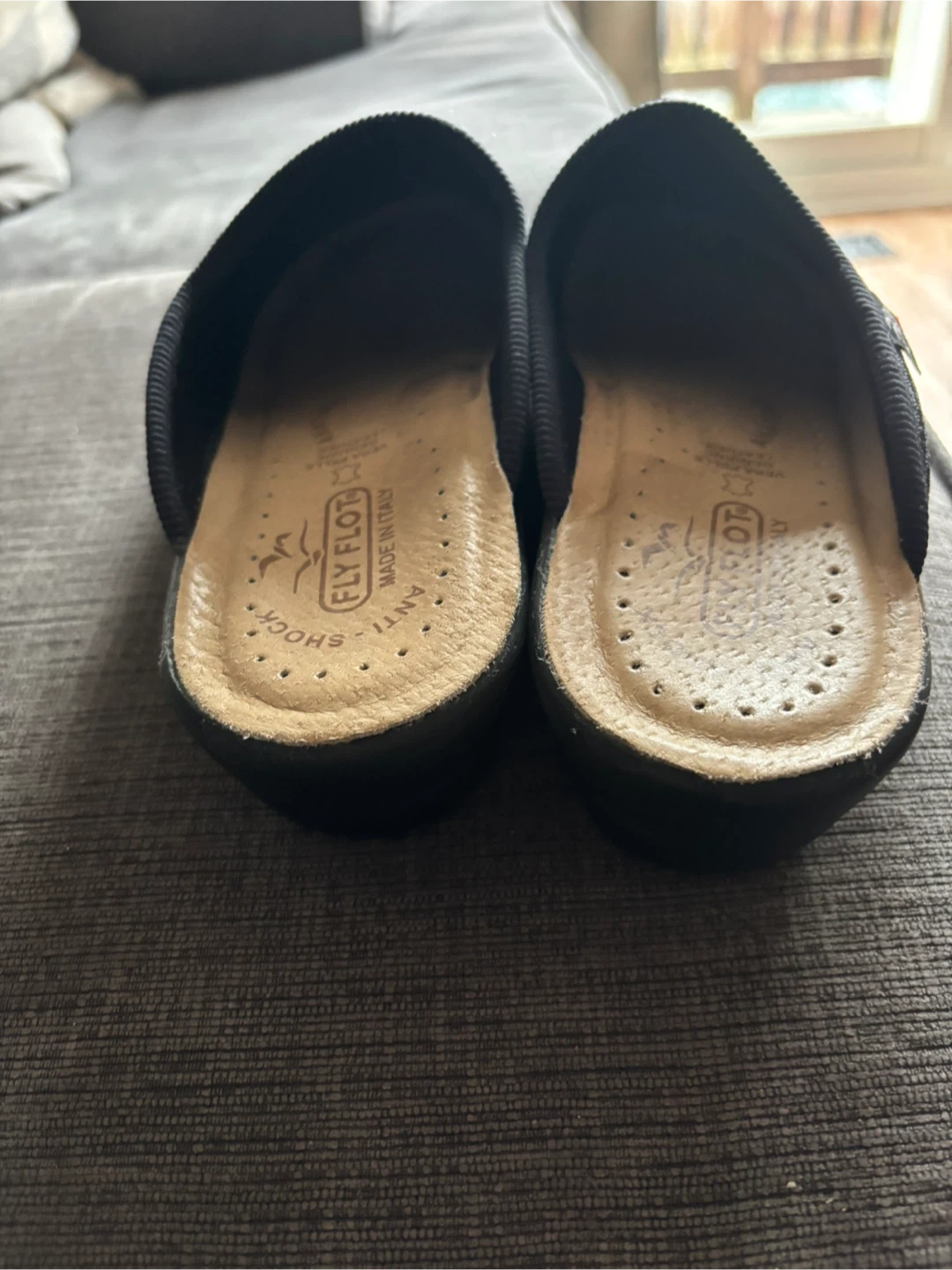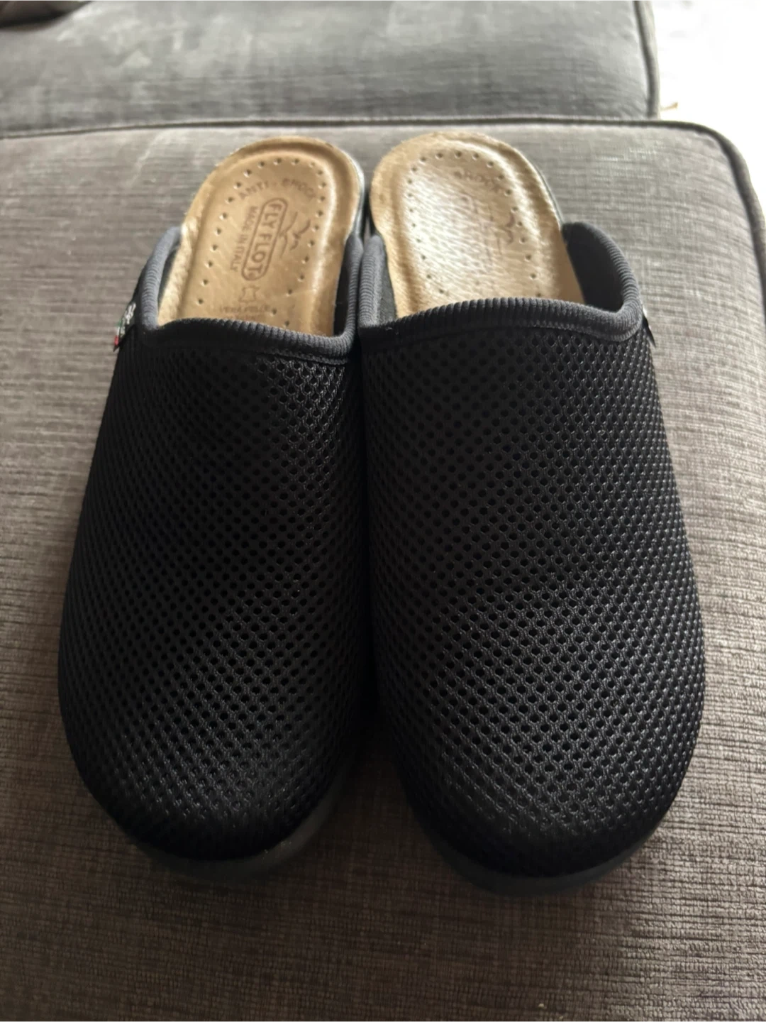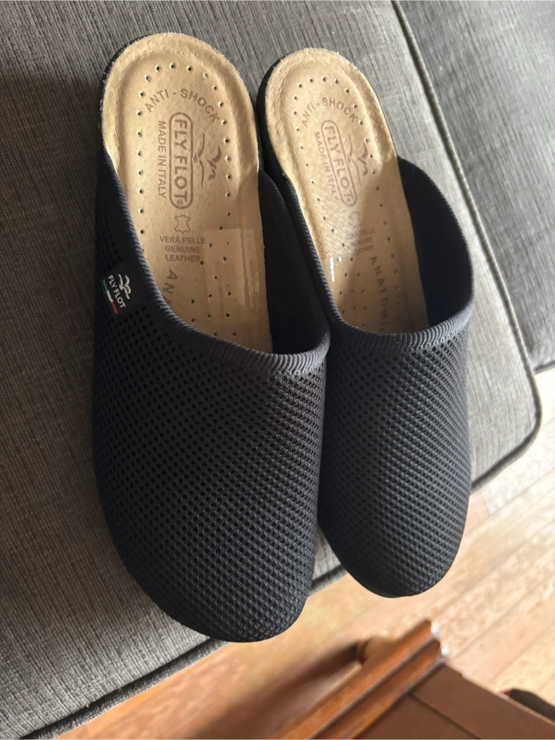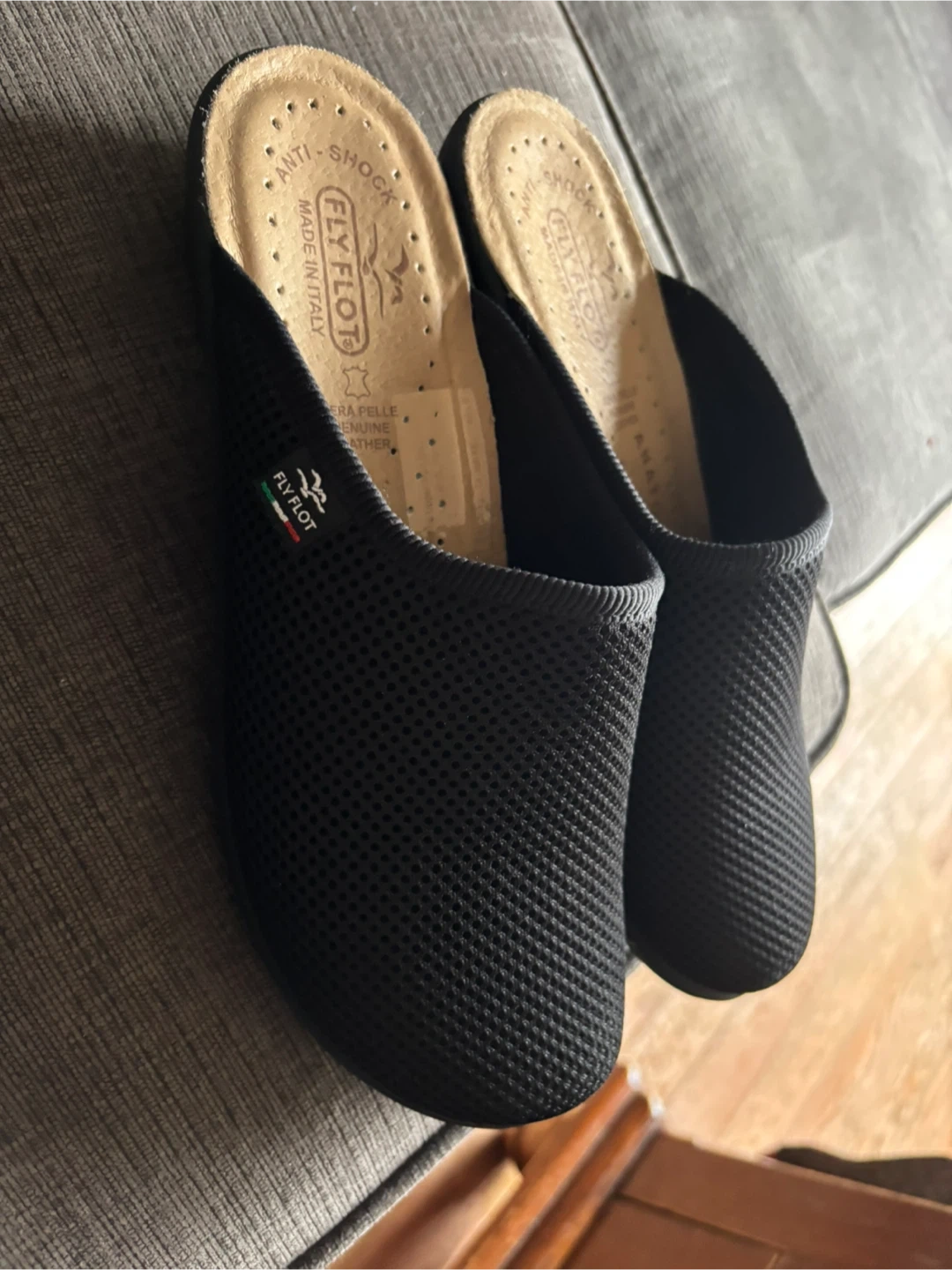 Fly Flot clogs in black mesh. They are in like new condition and are made in Italy. These clogs feature an anti-shock design for added comfort. Perfect for indoor or outdoor wear!