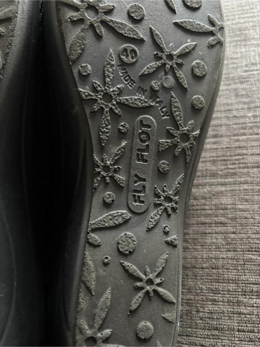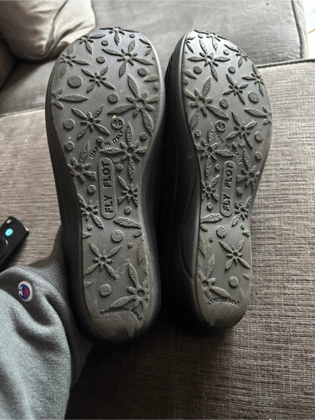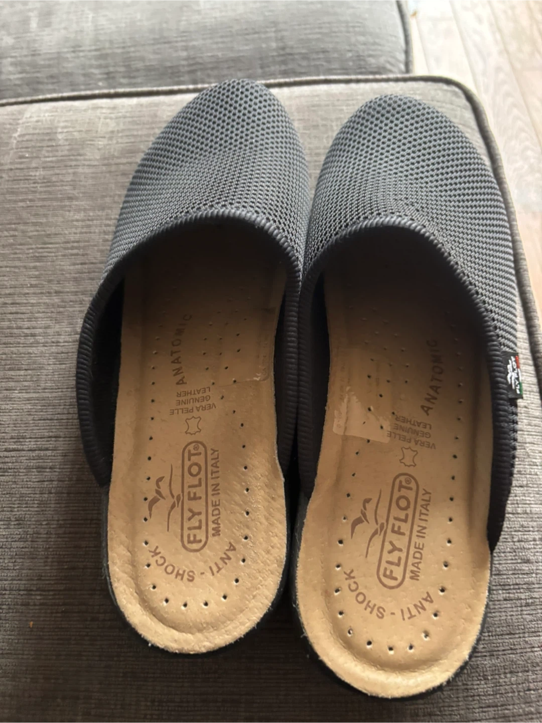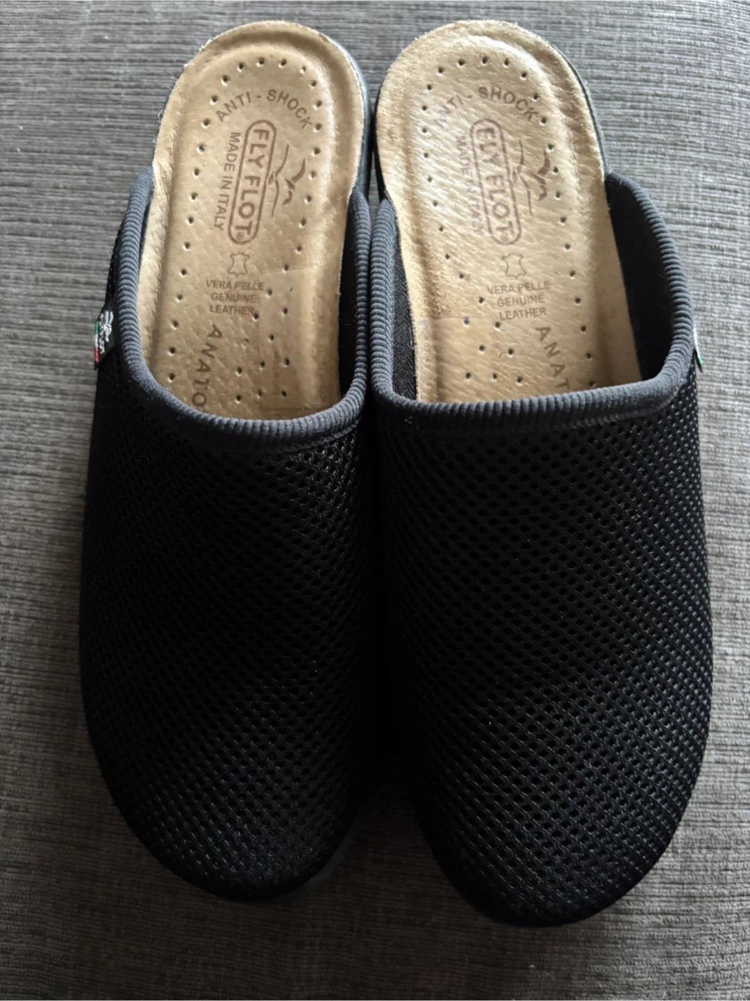 Fly Flot clogs in black mesh. They are in like new condition and are made in Italy. These clogs feature an anti-shock design for added comfort. Perfect for indoor or outdoor wear!