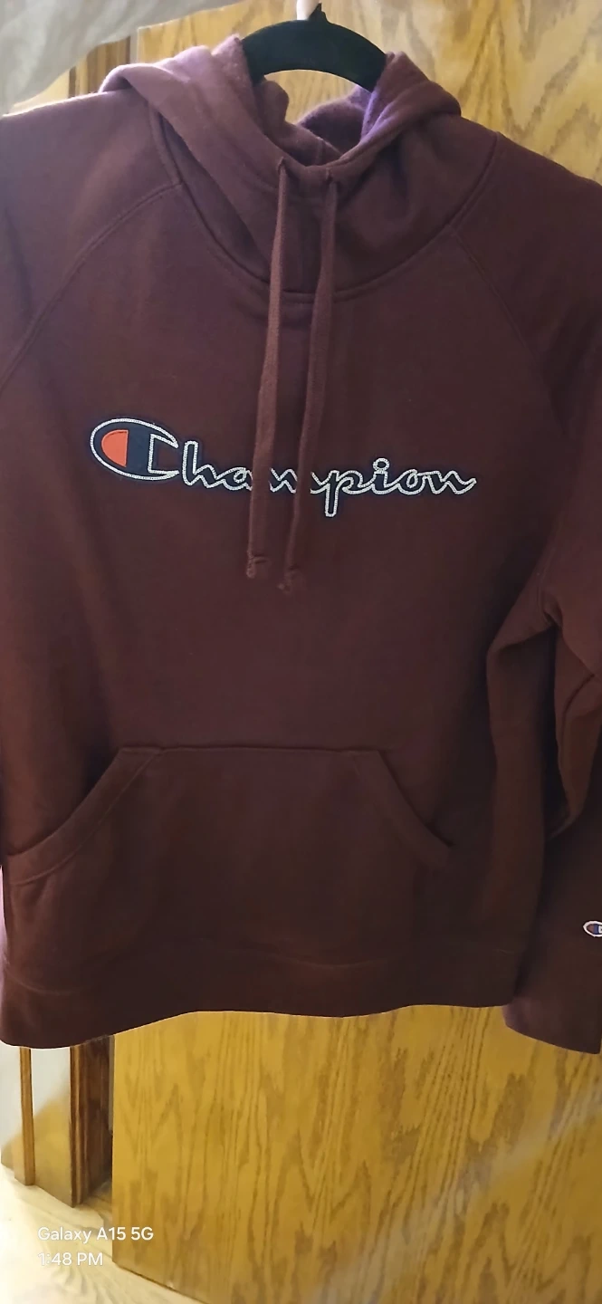 Here's a Champion hoodie in a burgundy color. It features the Champion logo on the front and a smaller logo on the sleeve. Great for staying warm and cozy! Pick up only