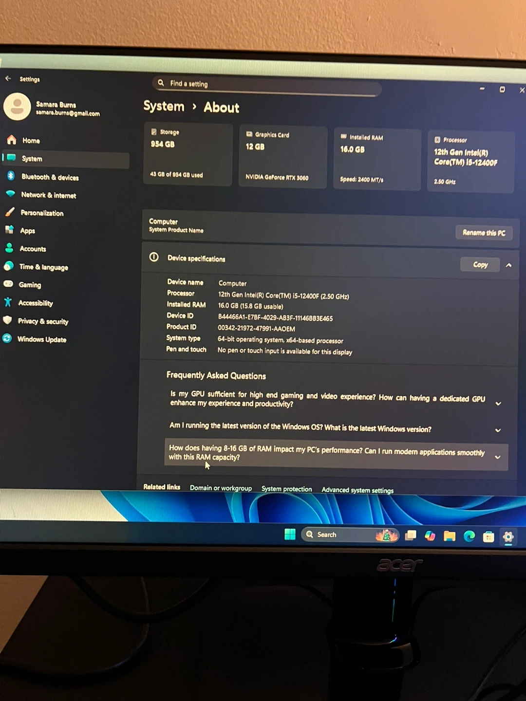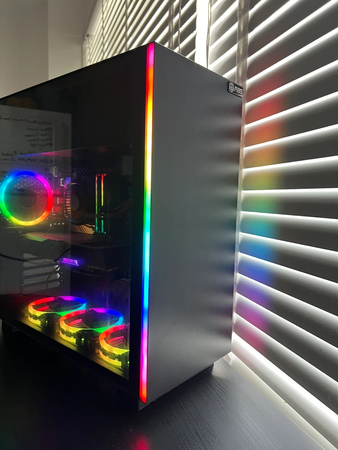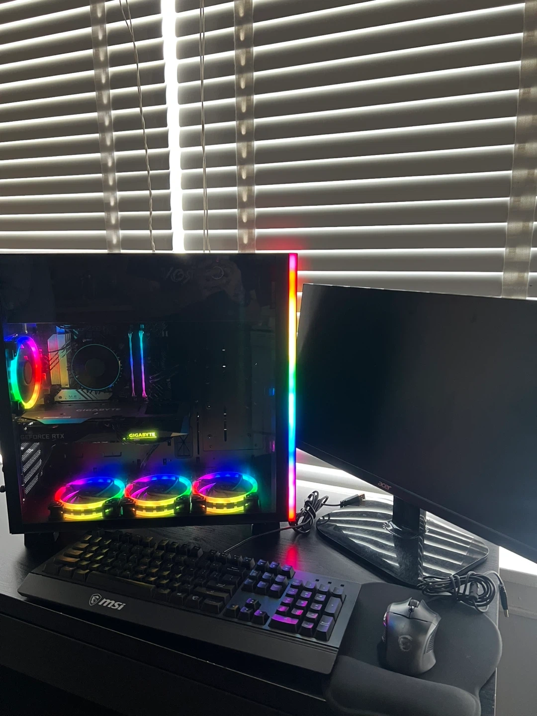Selling a custom-built gaming PC featuring an ABS case, Gigabyte RTX graphics card, and an MSI keyboard. The PC has vibrant RGB lighting throughout. Includes an Acer monitor as well. Great setup for gaming or other intensive tasks!