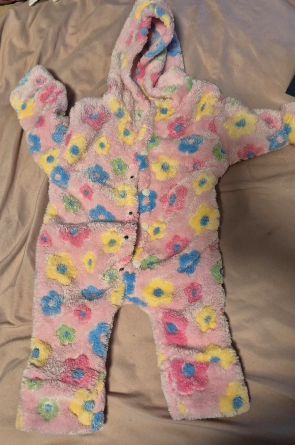 Here's a super cute and cozy baby onesie! It's pink with a colourful floral print and has a hood to keep your little one warm. Perfect for chilly days!