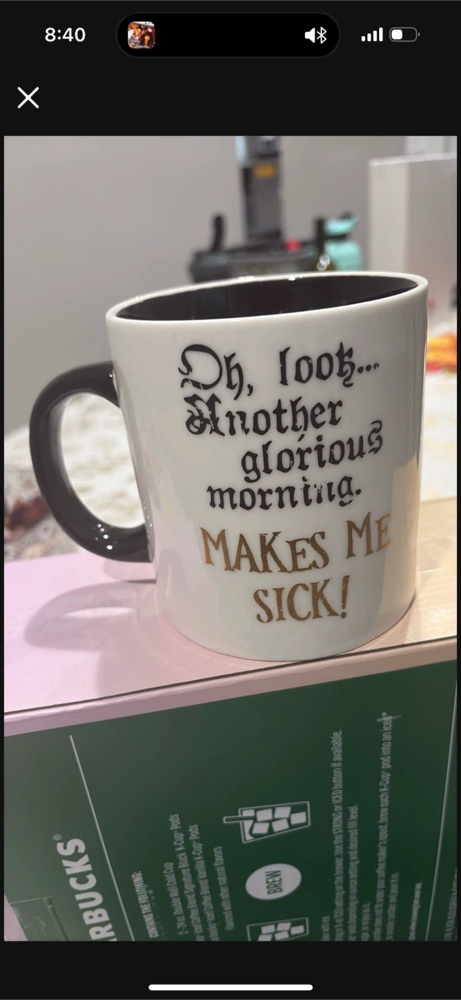 I'm selling a mug that says, "Oh, look... Another glorious morning. MAKES ME SICK!" It's white with a black handle and interior. It's in great condition and ready for a new home!