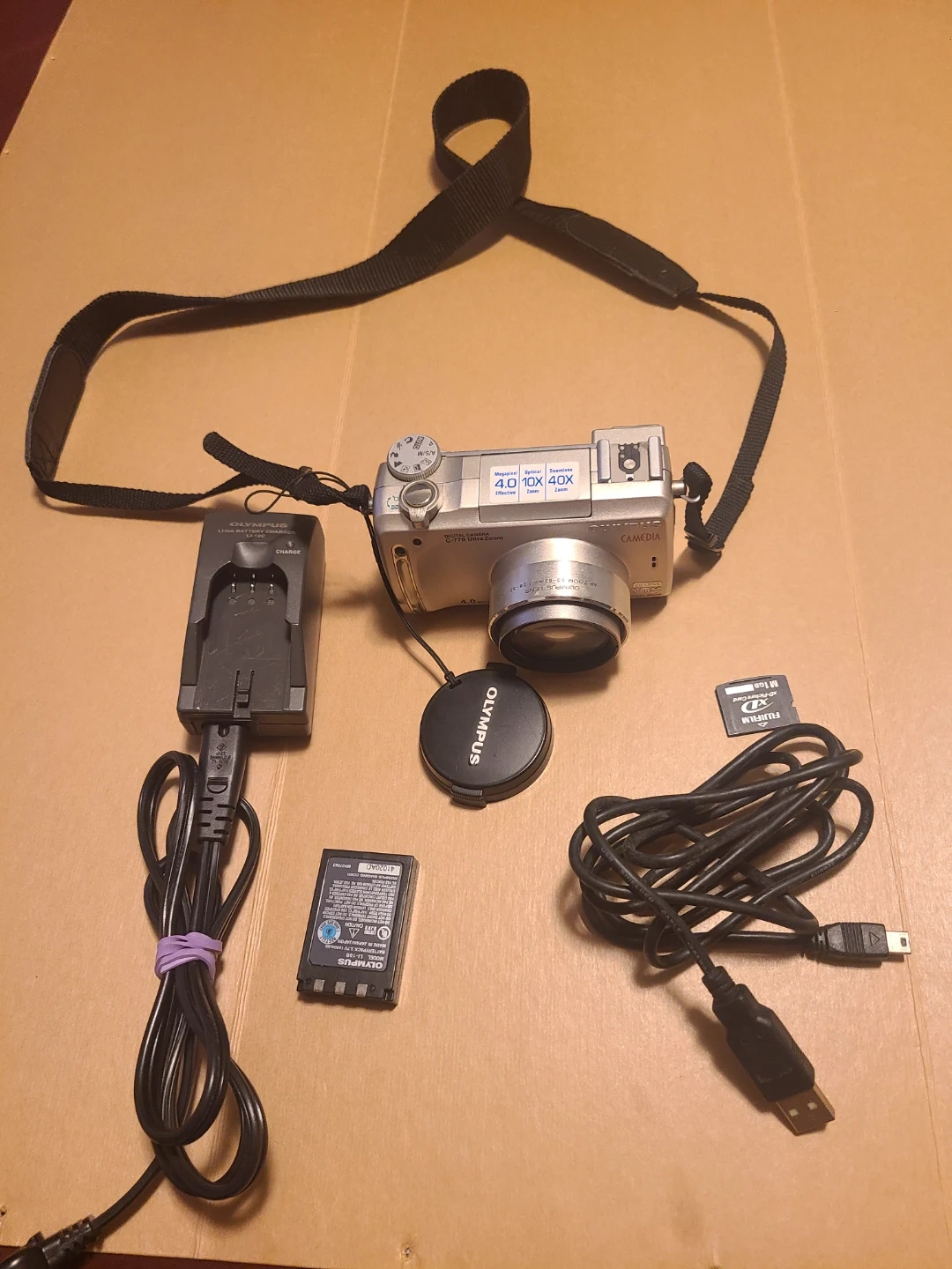 Selling an Olympus Camedia C-770 Ultra Zoom digital camera. It features a 4.0 megapixel sensor, 10x optical zoom, and 40x seamless zoom. It's in good condition and ready for a new photographer! Comes with Battery, Charger, XD Memory Card and USB Cable.