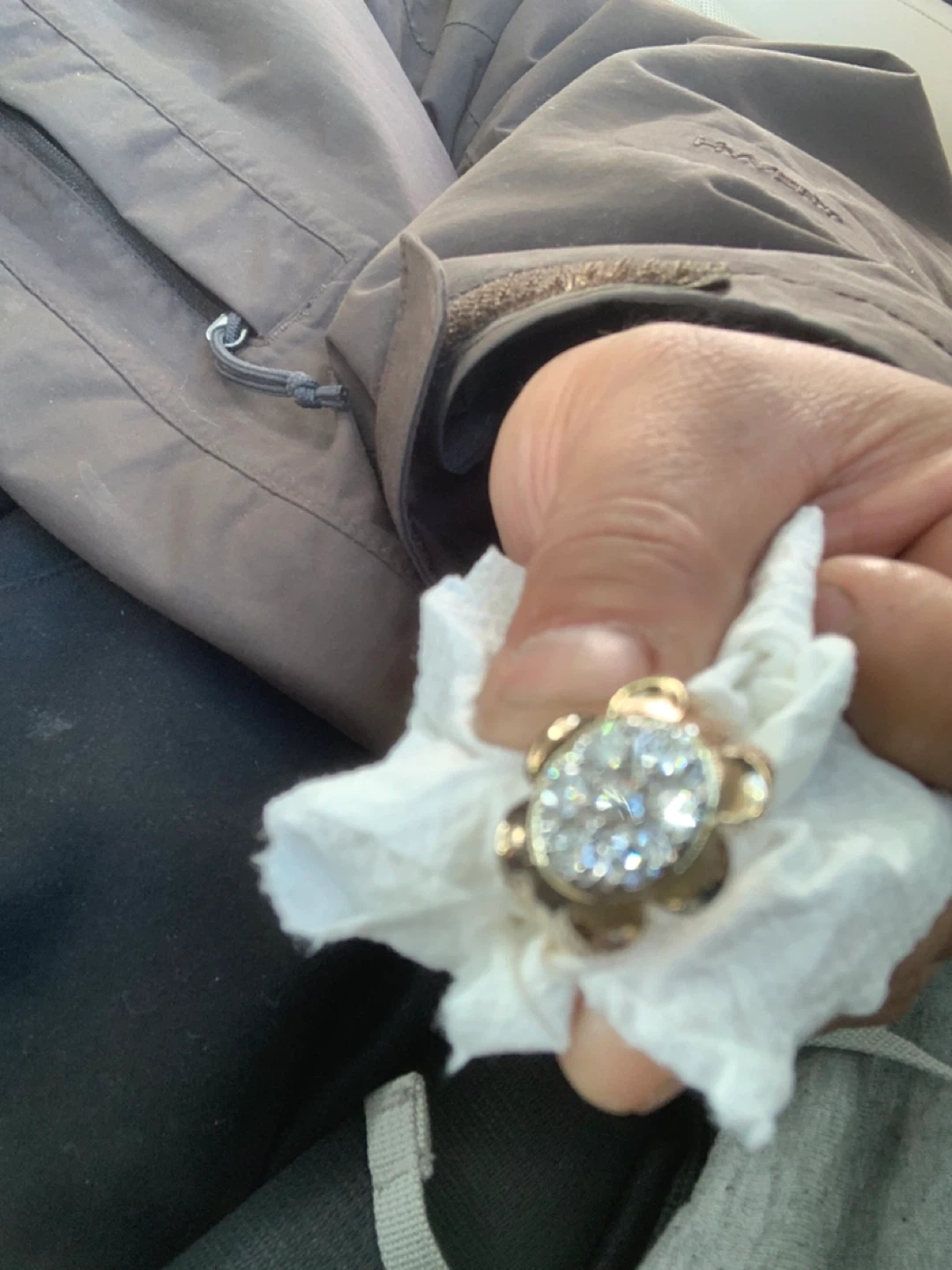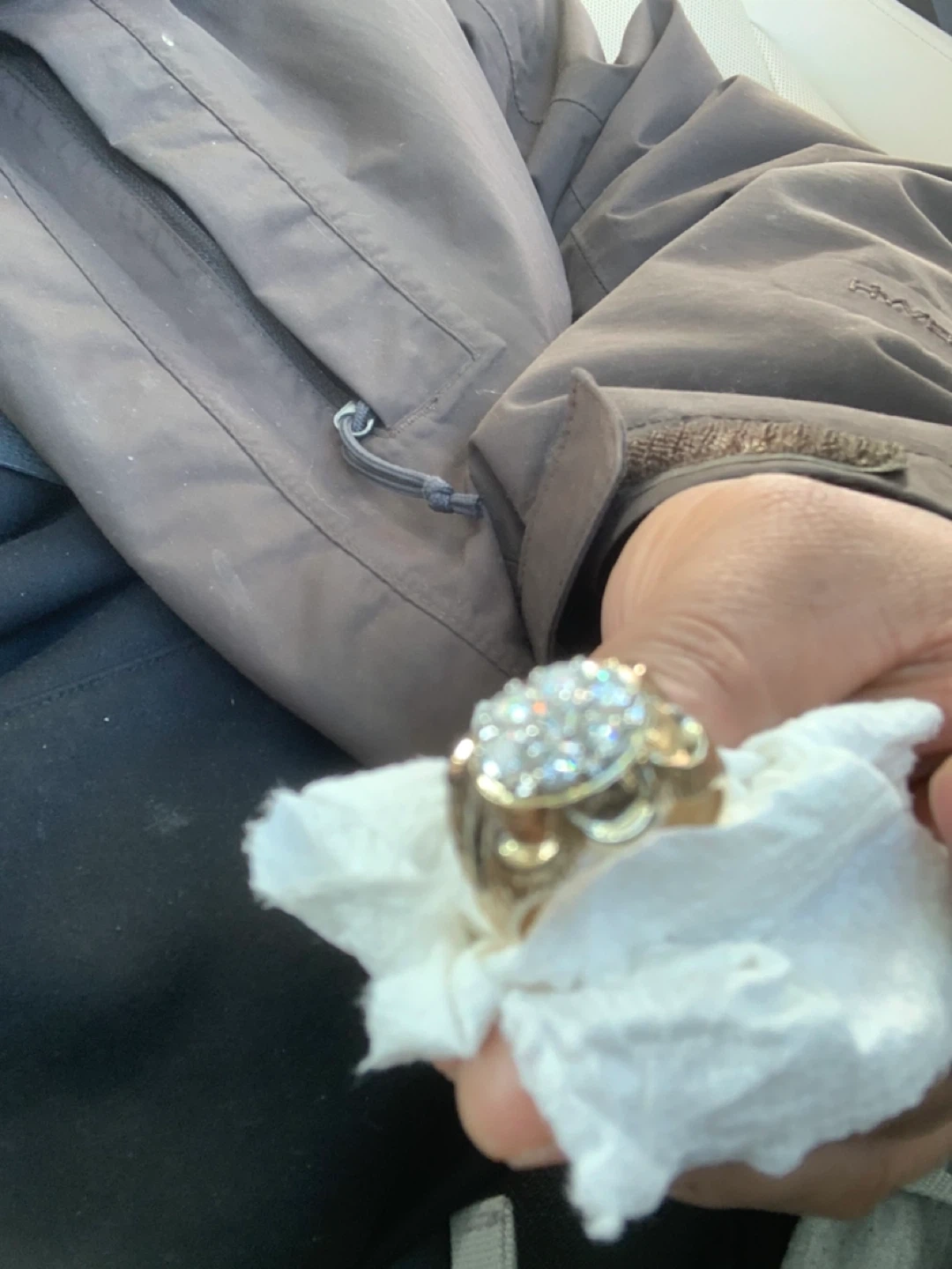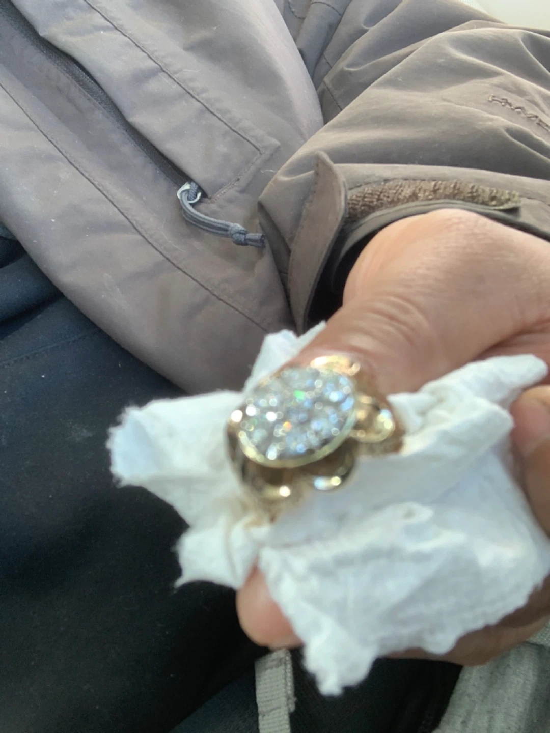 Selling a gold ring with a flower design and diamonds. It's in good condition and ready for a new owner! 14k 11gms 1KT diamonds