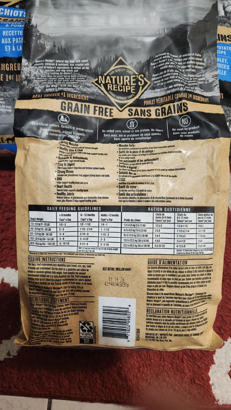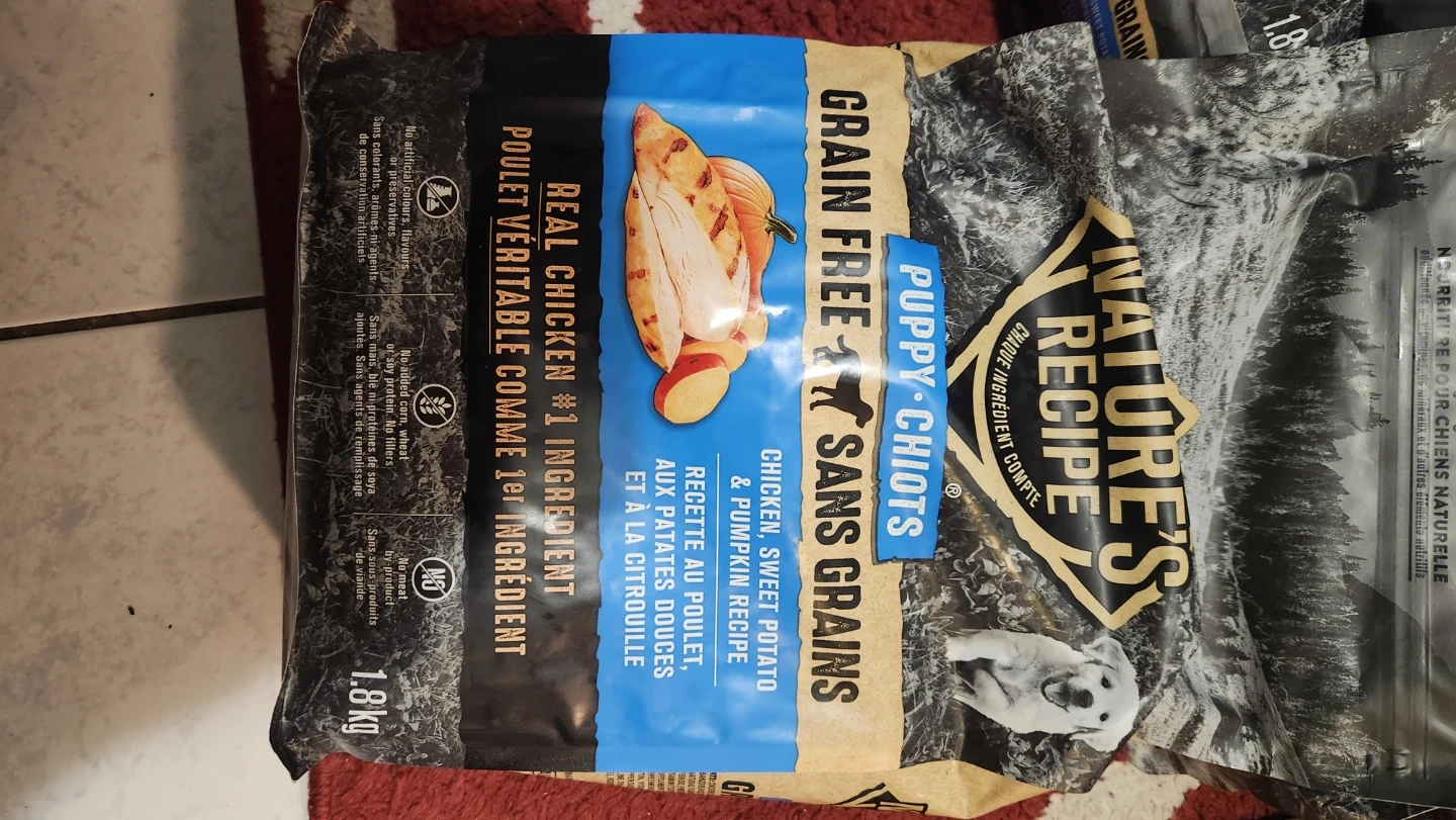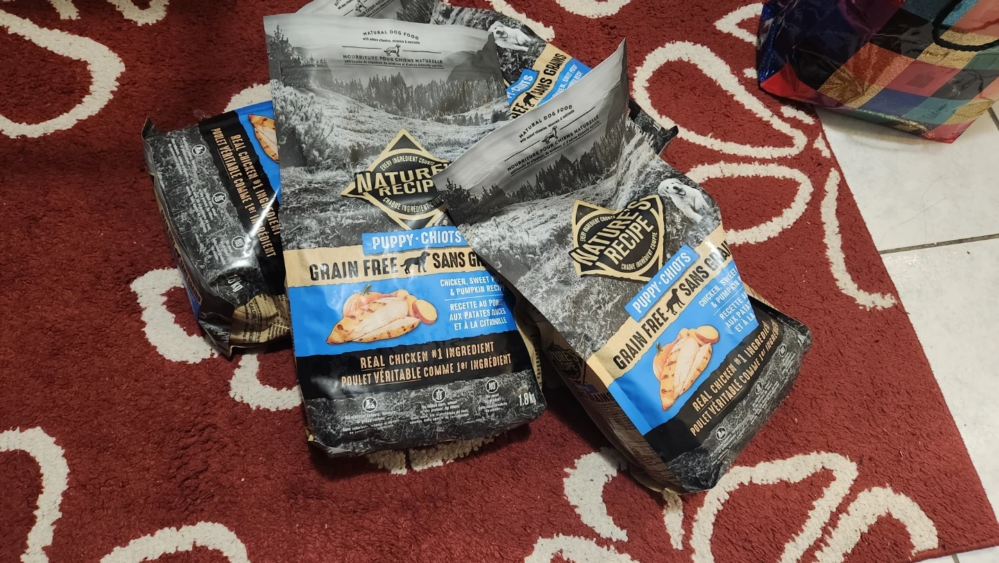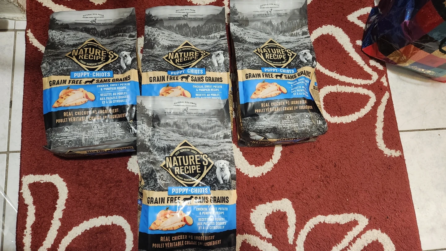 Selling bags of Nature's Recipe Grain Free Puppy food, its $10 for each. It's a chicken, sweet potato & pumpkin recipe that's great for your growing pup! It's made with real chicken as the #1 ingredient, so you know your furry friend is getting the good stuff