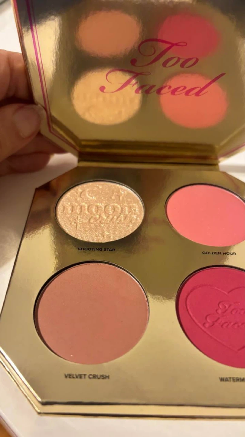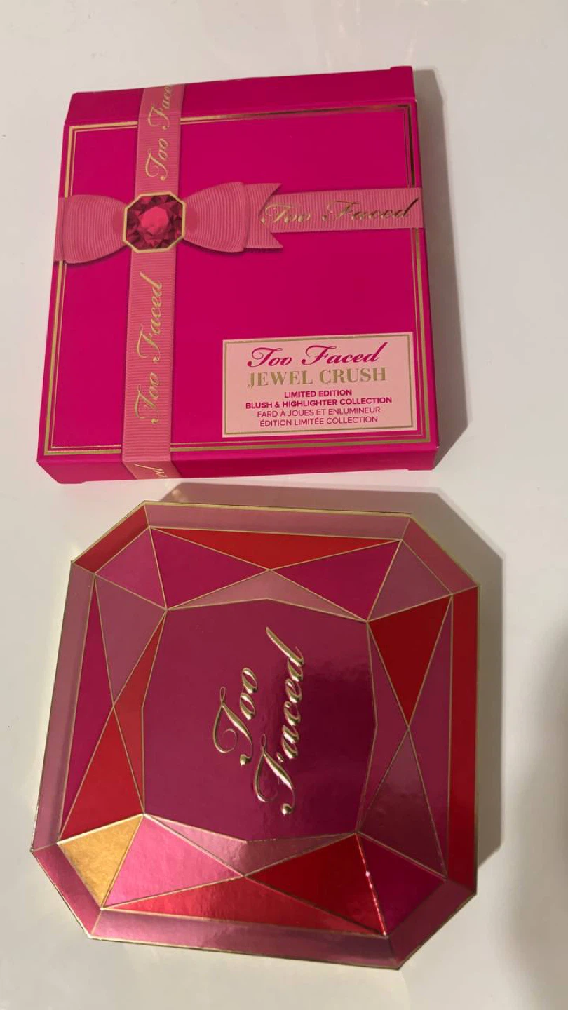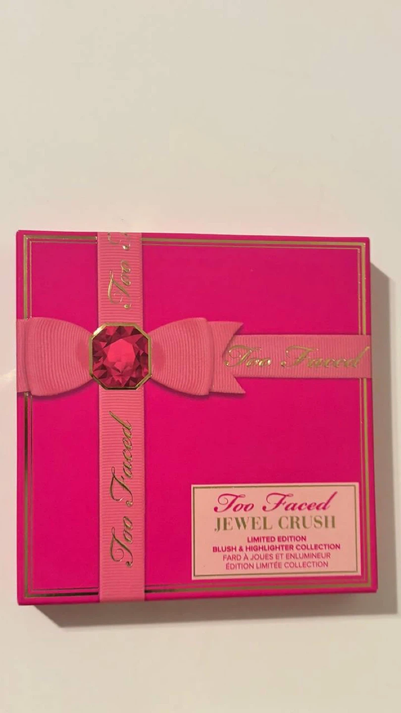 Selling a Too Faced Jewel Crush Limited Edition Blush & Highlighter Collection palette. It includes the shades Shooting Star, Golden Hour, Velvet Crush, and Watermelon. The palette comes with its original box