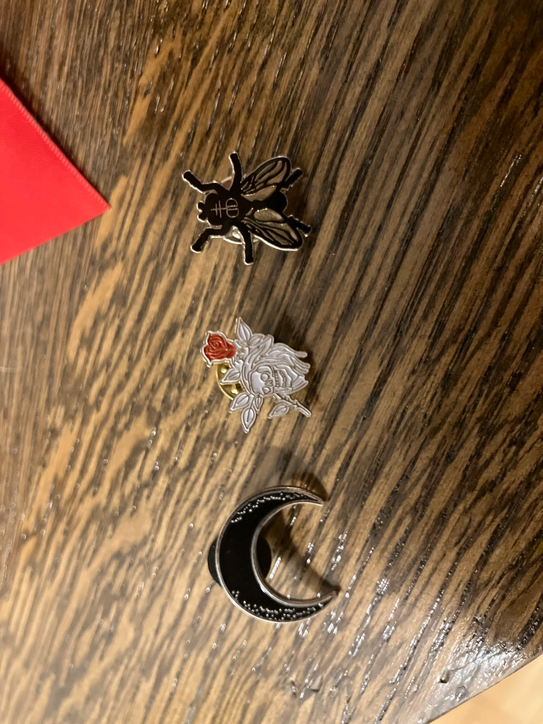 Selling a set of three cute pins! Includes a fly, a rose, and a crescent moon. They're in great condition and ready to add some flair to your jacket, bag, or pin collection!