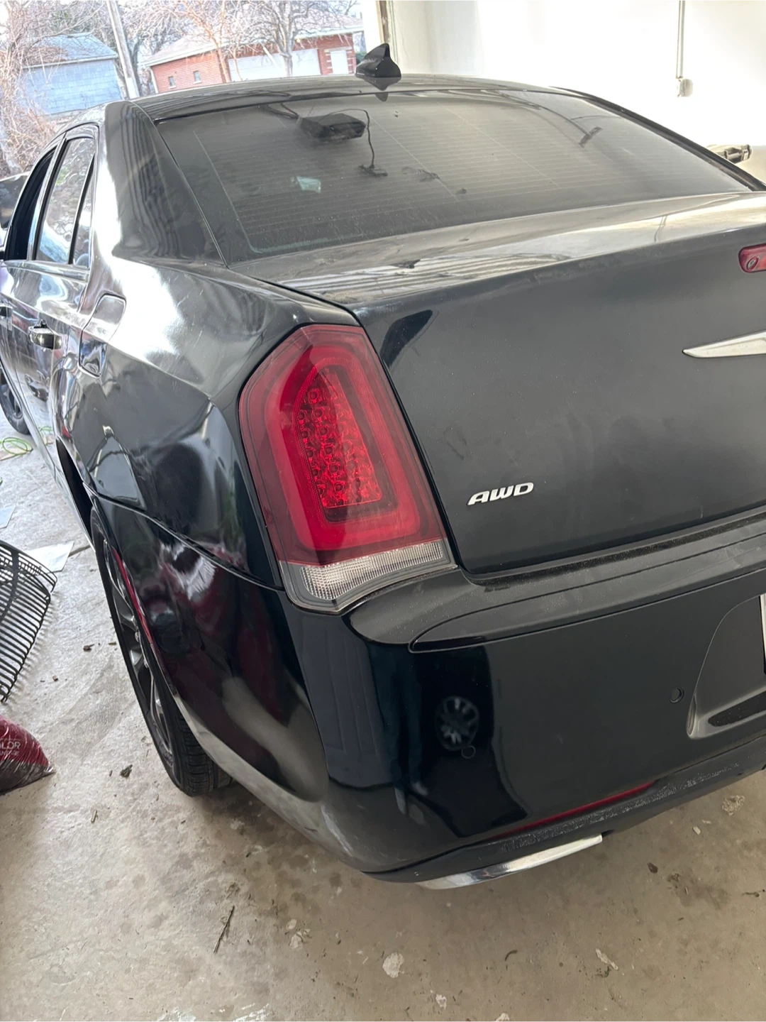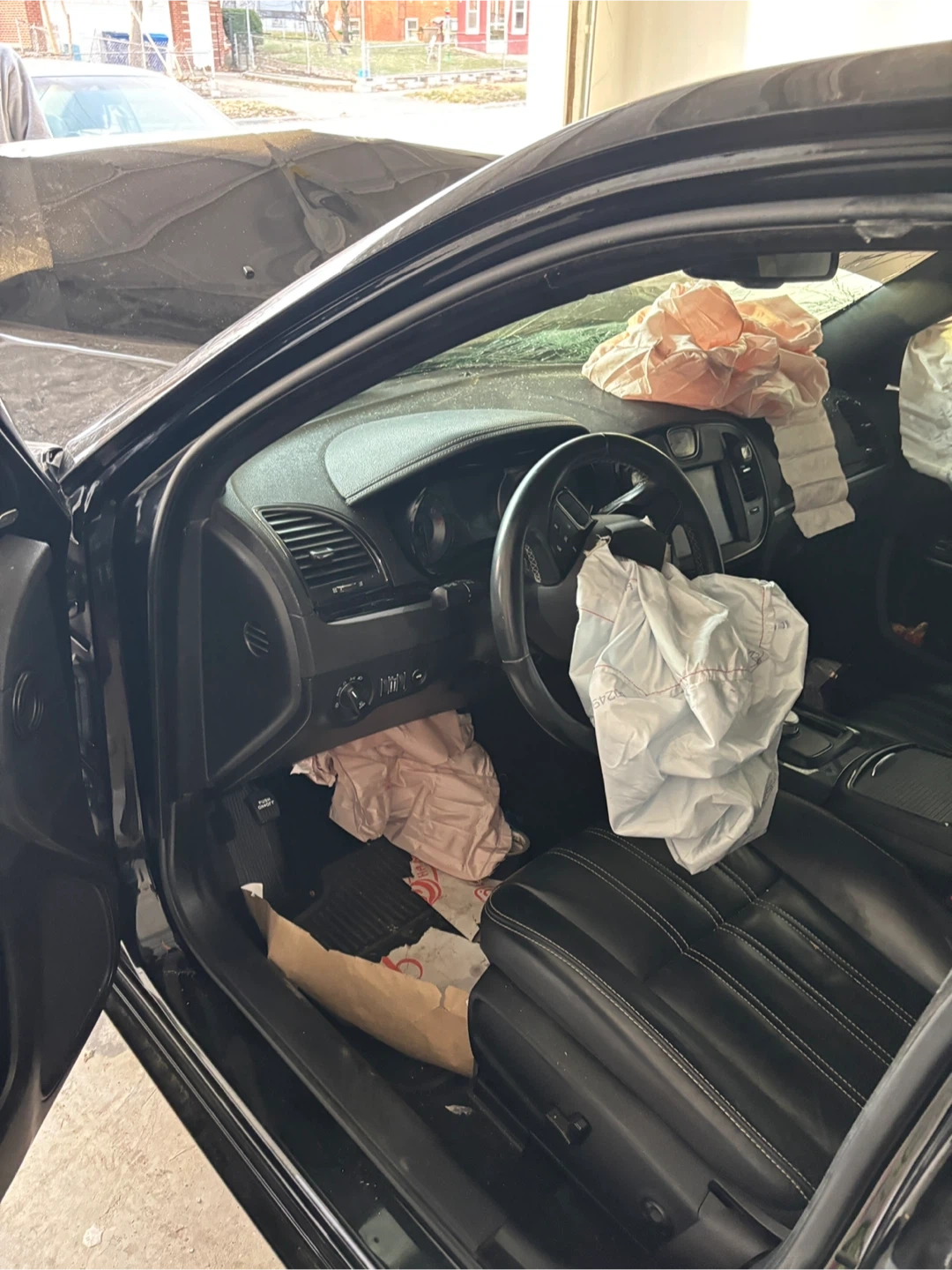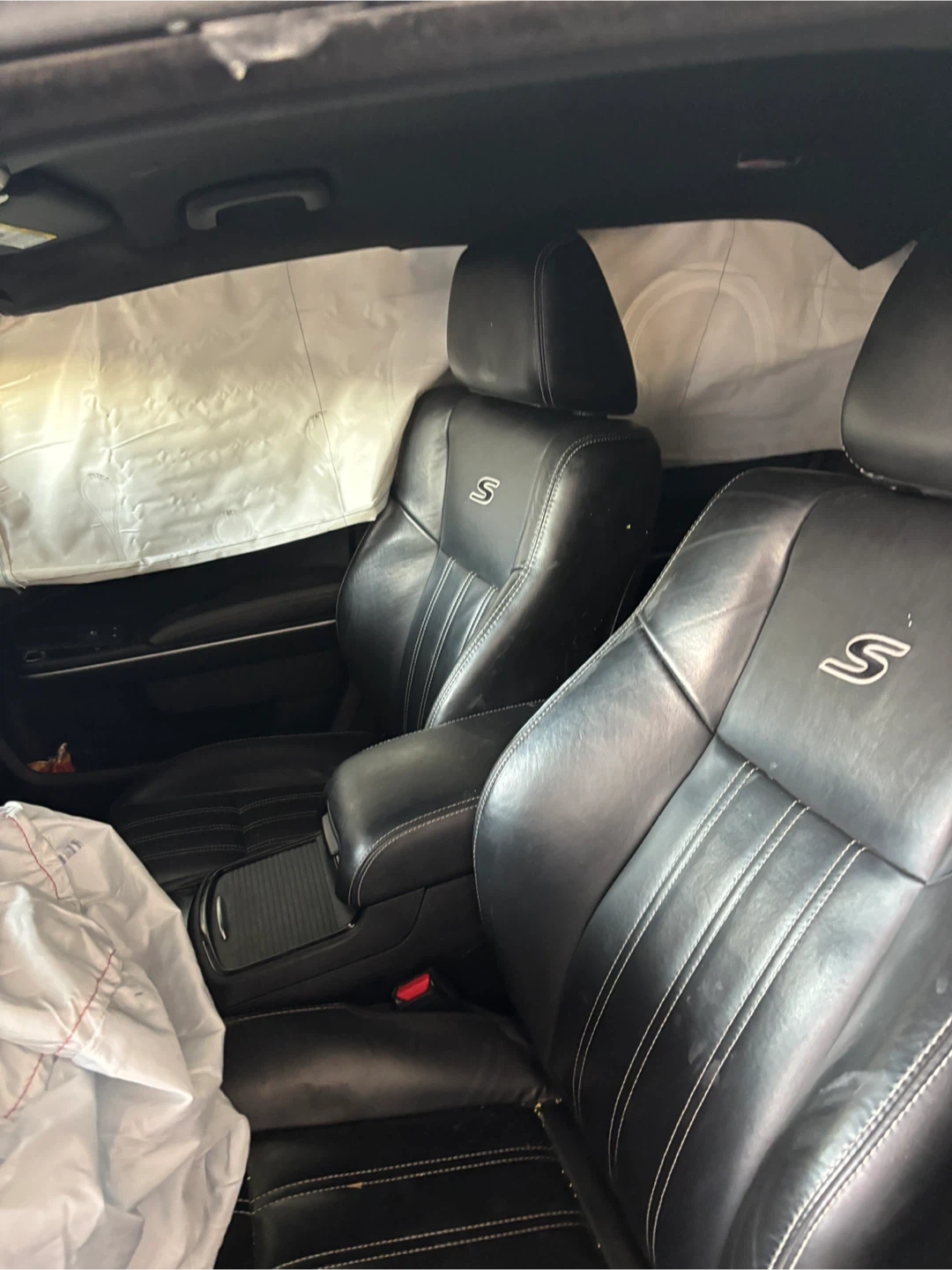 Selling a damaged 2019 Chrysler 300S. The car has deployed airbags and some body damage. It could be a good source of parts or a repair project for someone. The seats are black leather with an 'S' logo. The tires are Courser Quest.