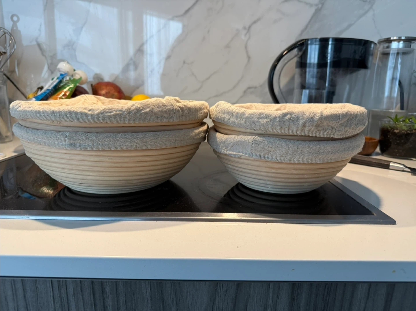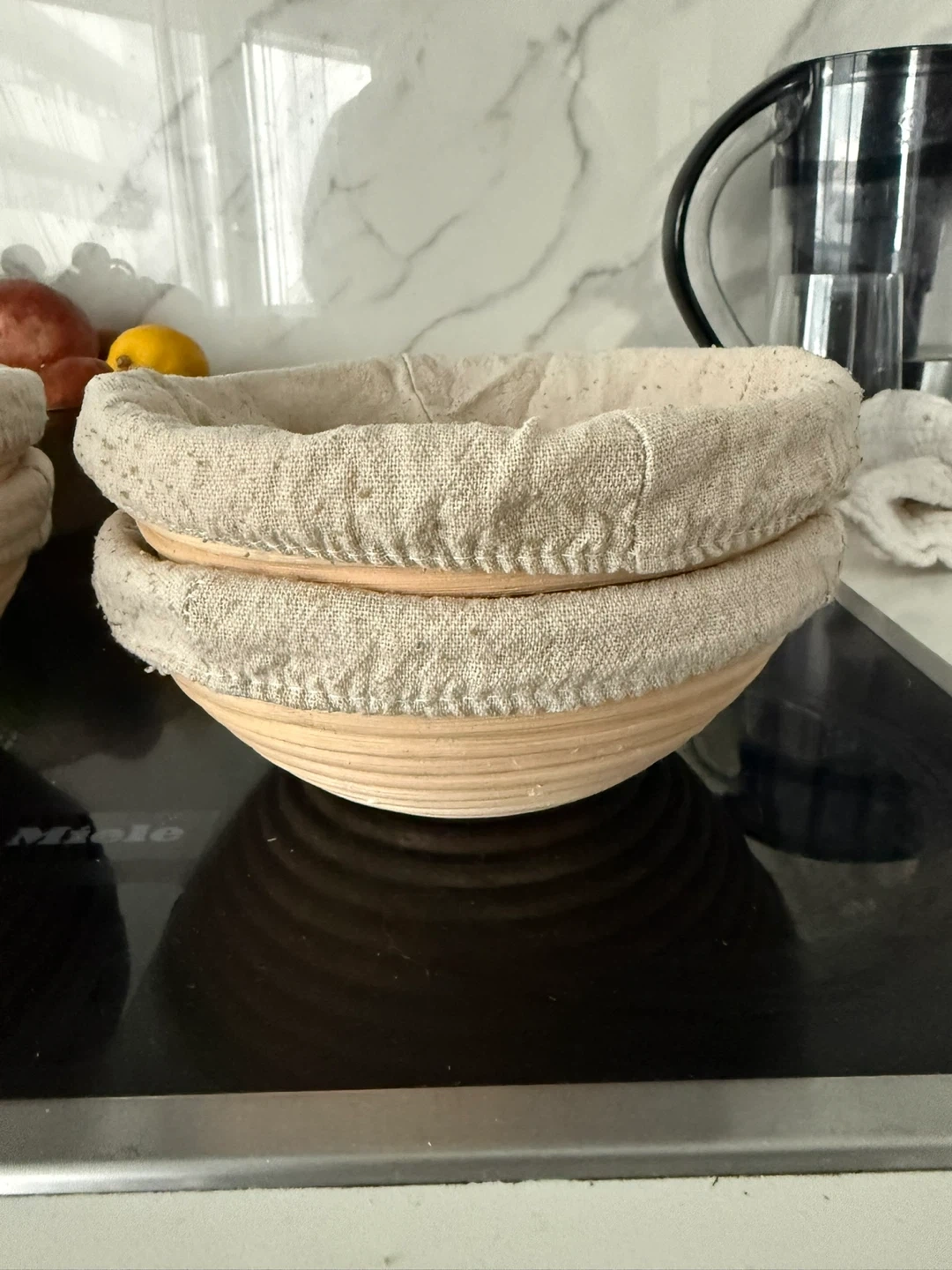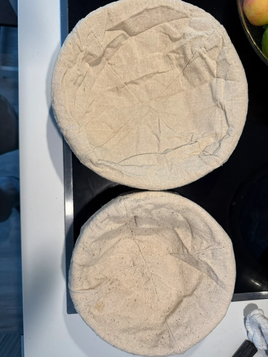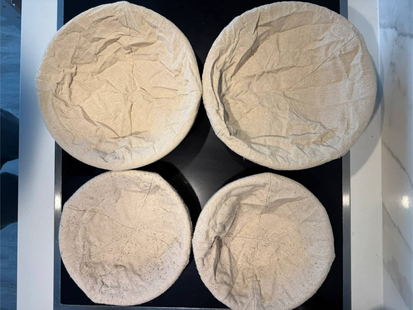 Selling a set of four banneton bread proofing baskets. These baskets are great for shaping your dough during the proofing process, helping you achieve a beautiful crust and shape for your homemade bread. They're in good condition and ready for a new baker!