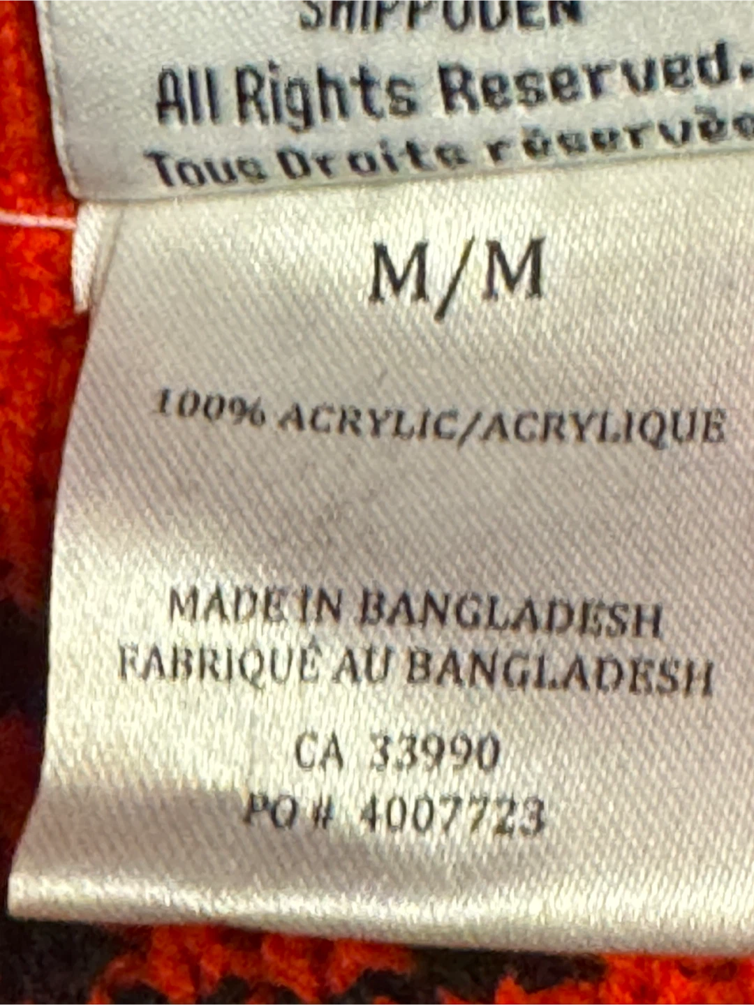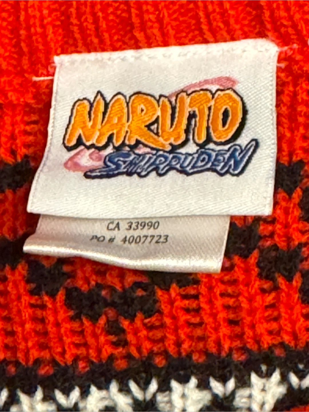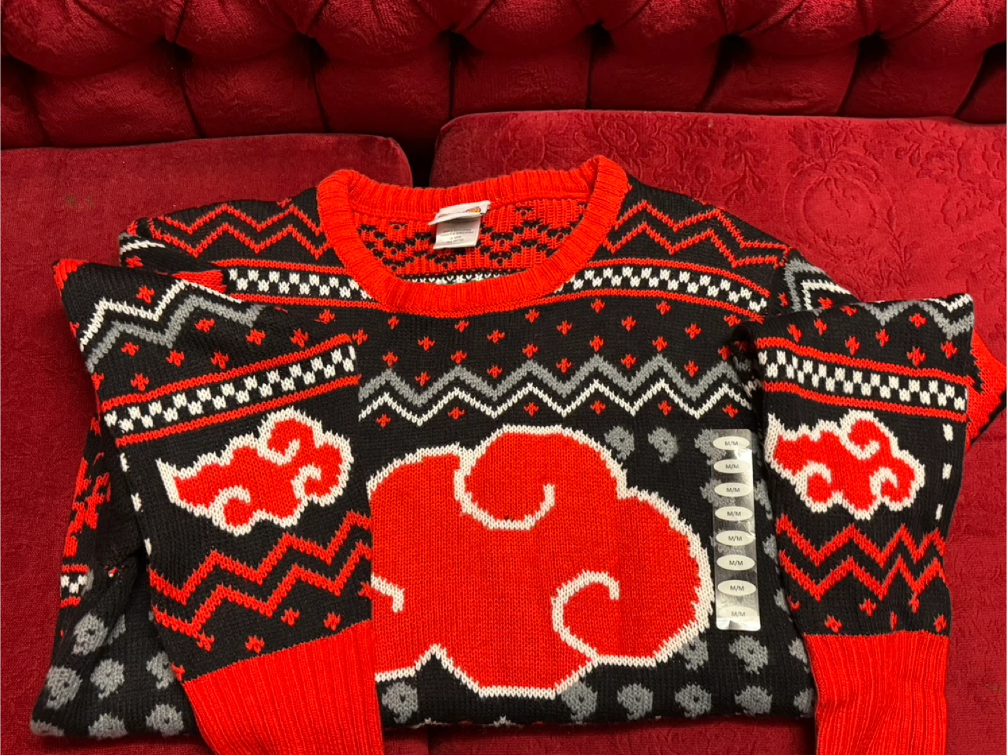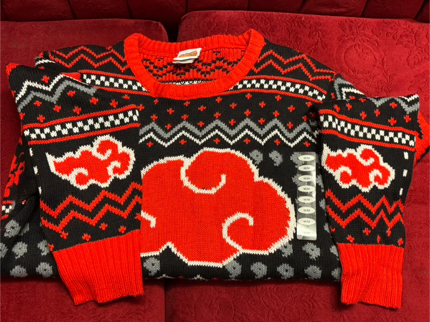 Selling a Naruto Shippuden sweater in size M/M! It features a cool design with red clouds and other geometric patterns. The material is 100% acrylic, so it's nice and cozy for cooler weather