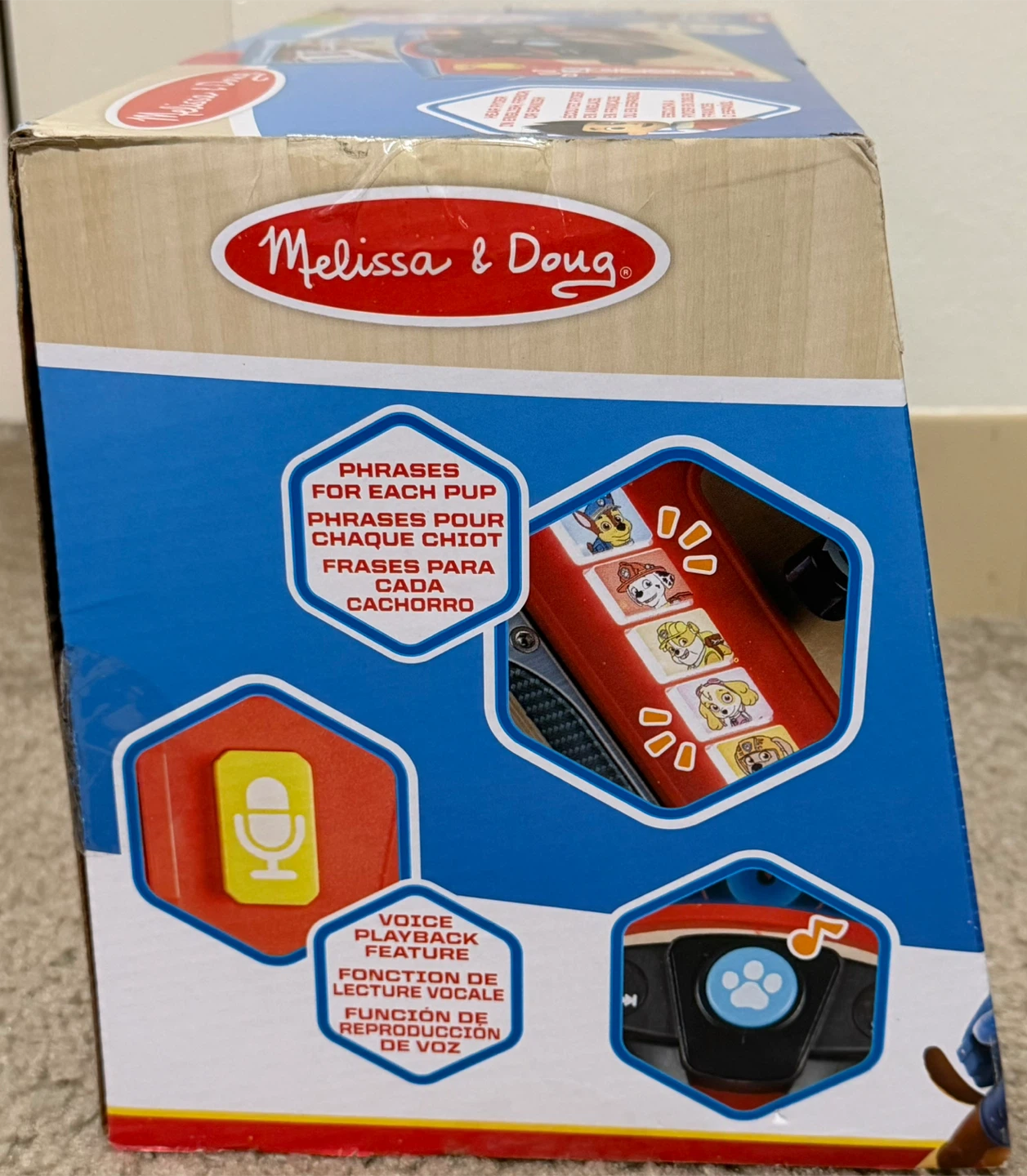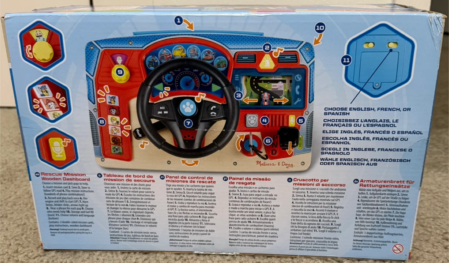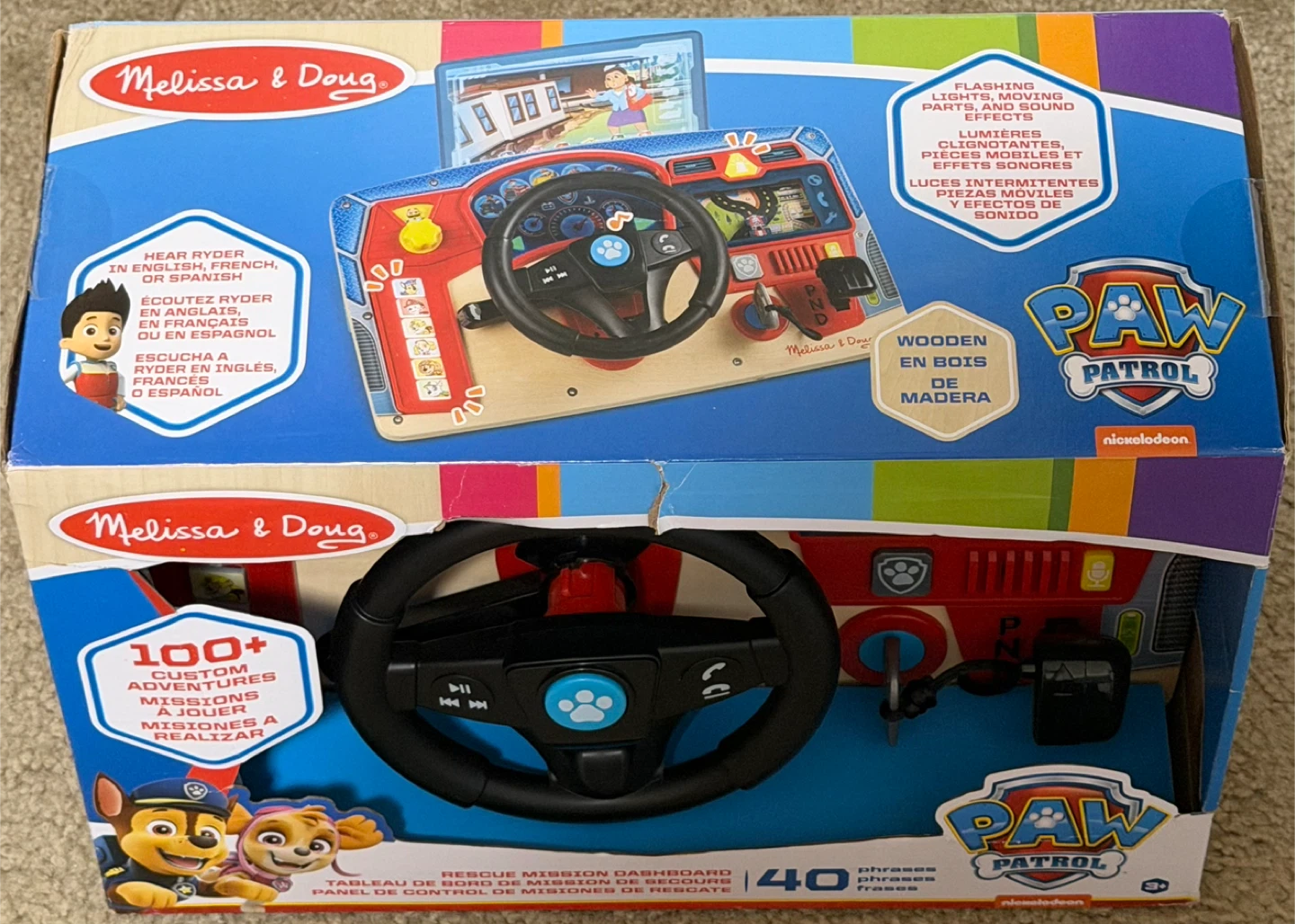 Selling a Melissa & Doug Paw Patrol Rescue Mission Wooden Dashboard! It features lights and sounds, a scrolling map/GPS, and voice playback features. It also includes 100+ custom adventures and 40 phrases for each pup. Choose English, French, or Spanish!