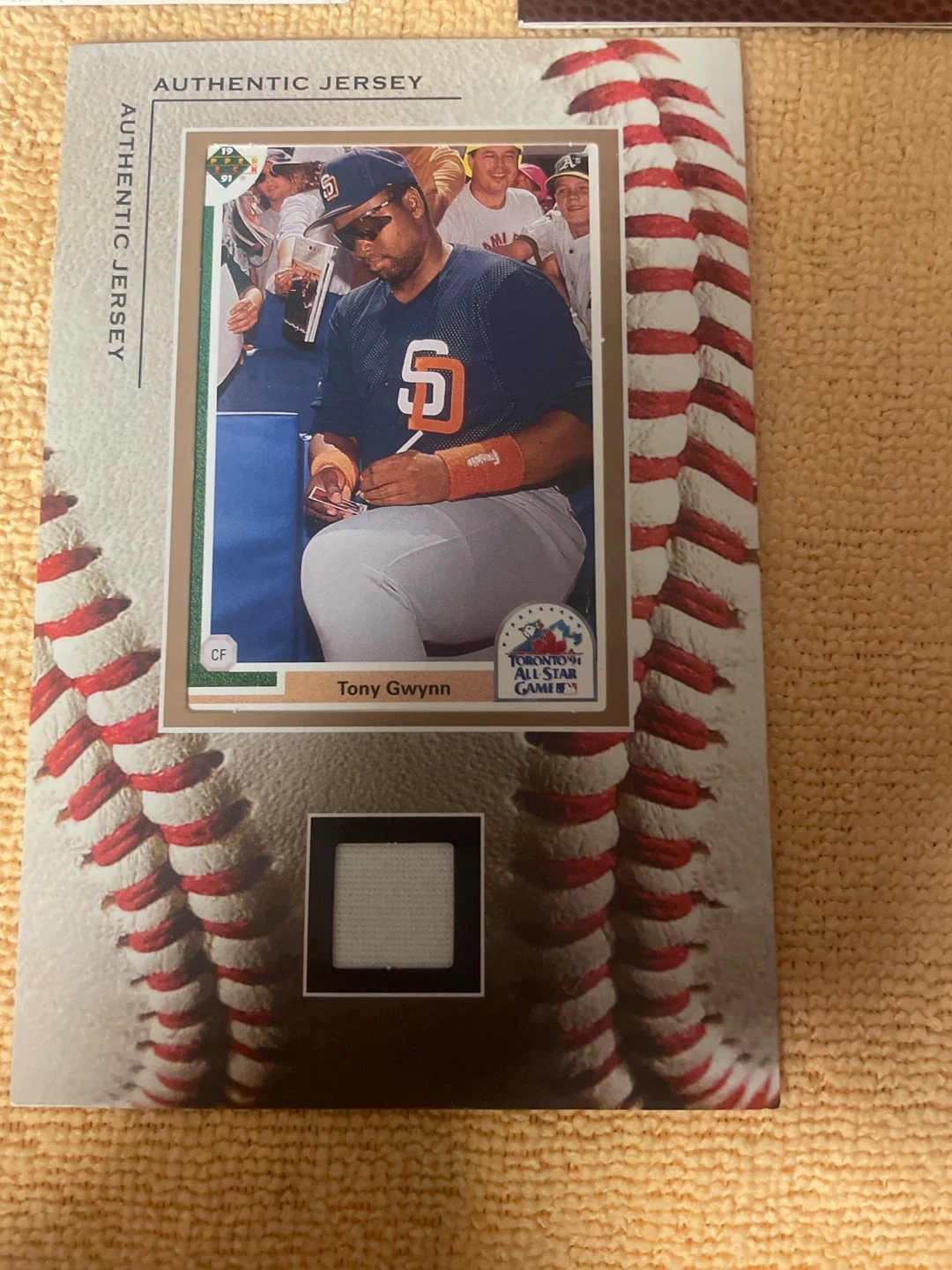 Selling a collection of Upper Deck Authentic Jersey cards. These cards feature pieces of game-worn jerseys from Tony Gwynn, Tracy McGrady, and Brian Brohm. Great for sports memorabilia collectors!
