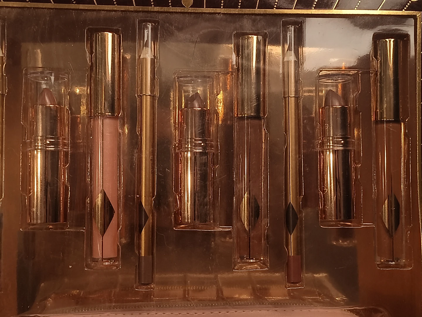 This set includes 3 sets of matching lip liner, lipstick, and gloss in colors: