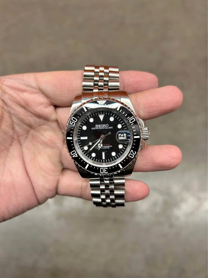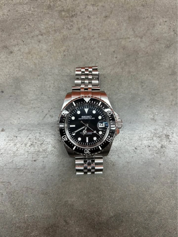 Selling a Seiko automatic Submariner-style watch in very good condition. This is a custom/modded build featuring a Seiko automatic movement with a classic diver look.