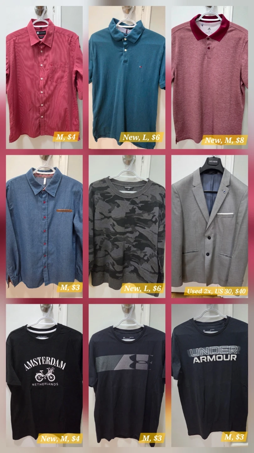 Buy one or more of these men's tops (shirt, polo shirt, long sleeves, etc.), some are branded. I put in the picture if it's brand new, the size (M for Medium, L for Large), and the price. My size is between M or L. The prices are final, even if you're buying more than one. They're the lowest I will give (save $$), or you can buy elsewhere. Everything's in perfect or great condition. If picture is posted, it's available. Just let me know which one(s) you're buying.