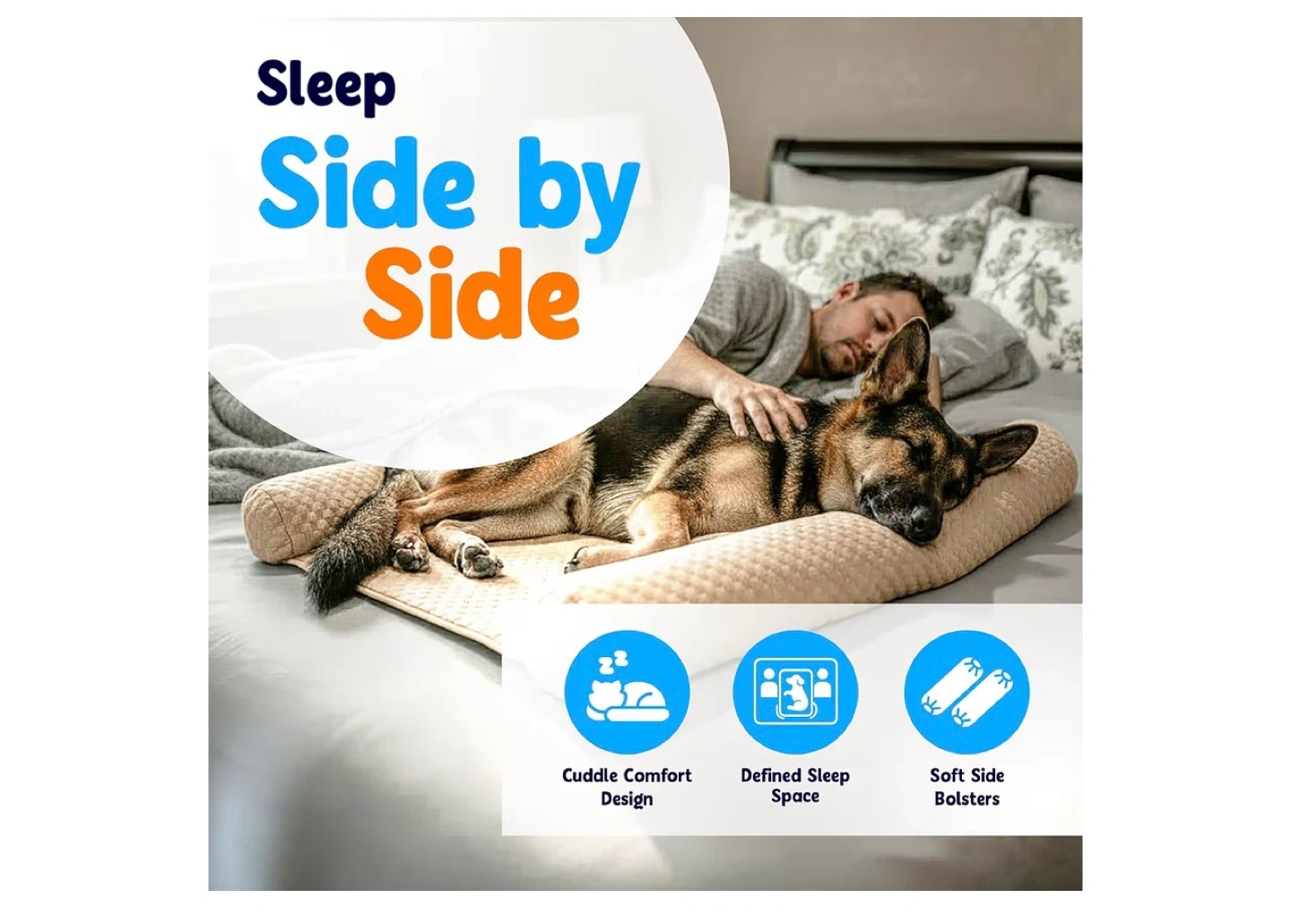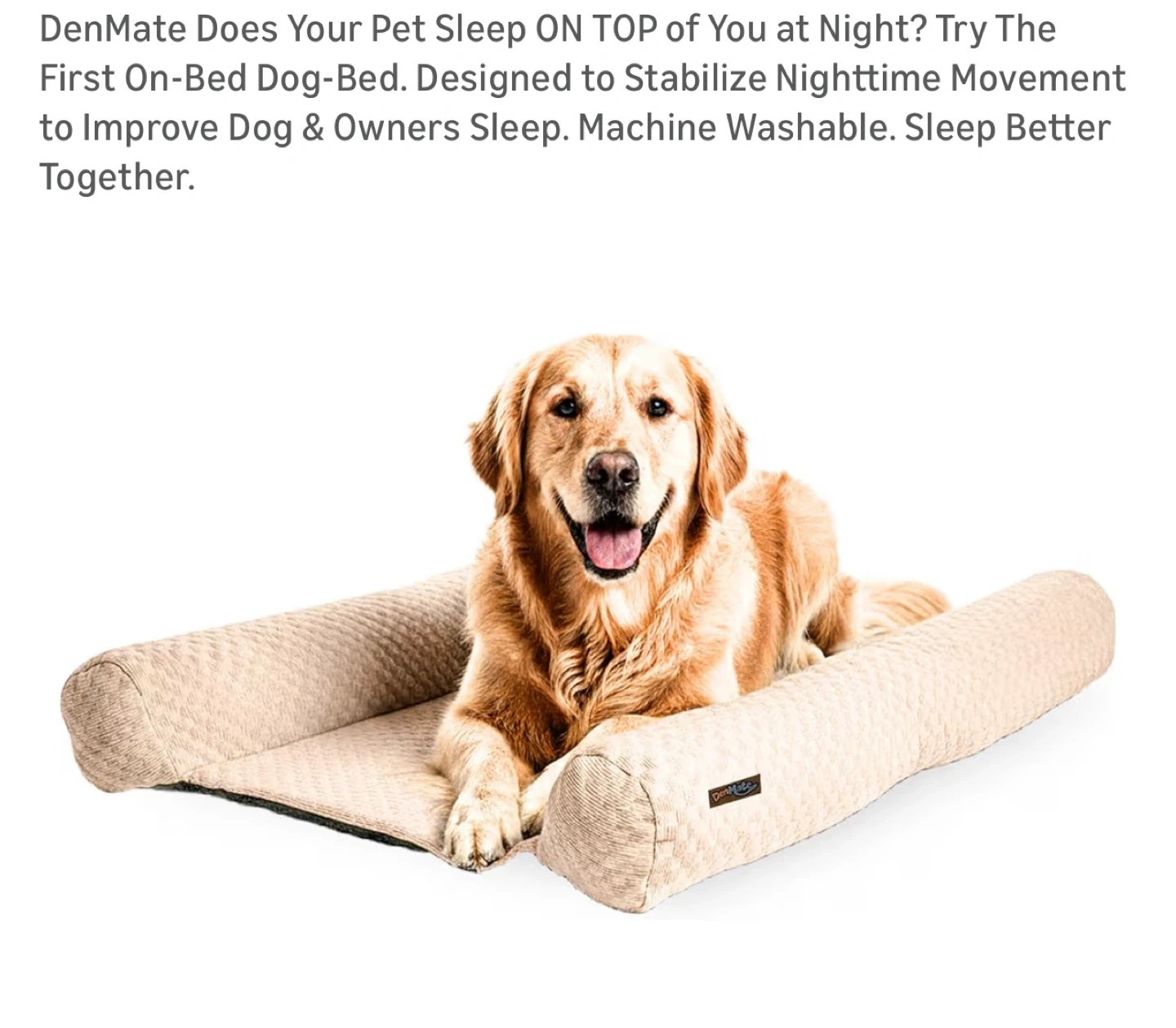 Selling a DenMate On-Bed Dog Bed! It's designed to stabilize nighttime movement to improve sleep for both dogs and their owners. The bed is machine washable and features a cuddle comfort design with defined sleep space and soft side bolsters. Dimensions are 26 inches by 40 inches, with a height of 5 inches. Great for dogs who like to sleep beside you!