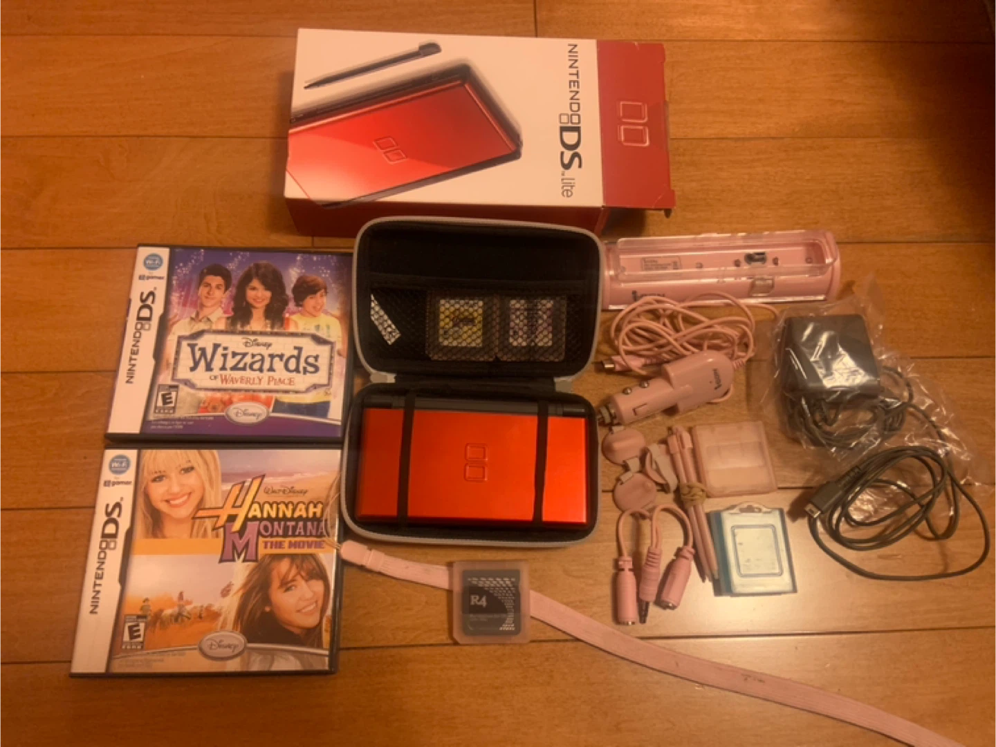 Selling a Nintendo DS Lite with a bunch of extras! It comes with the original box and charger. Also included are 3 games: Wizards of Waverly Place, Hannah Montana The Movie, and a R4 (100 games including Mario Kart). Extra accessories come with it: case, extra game boxes, stylus, car adapter, and standing charging station, plus more. Feel free to reach out! No cracks/scratches - works like brand new.