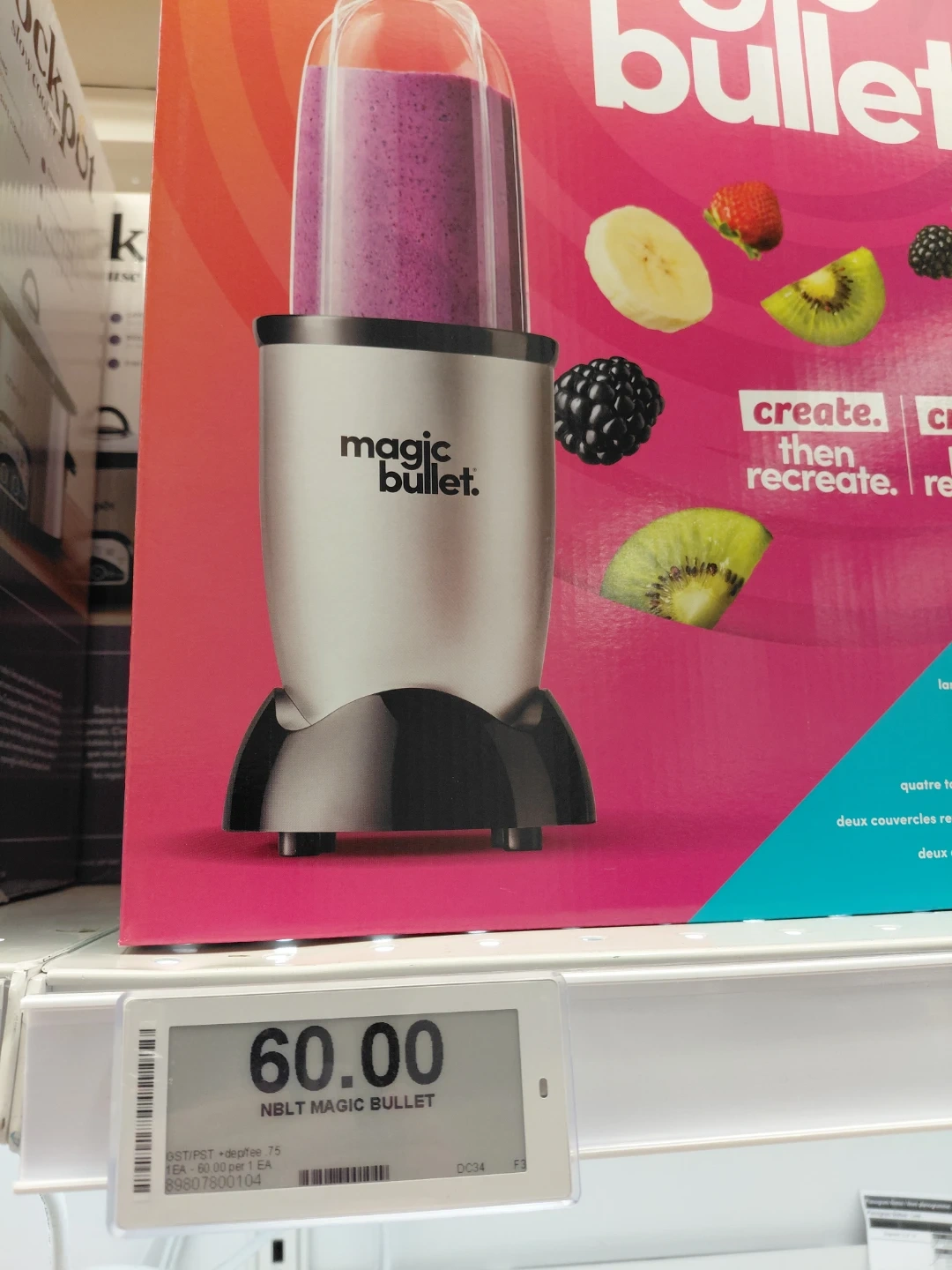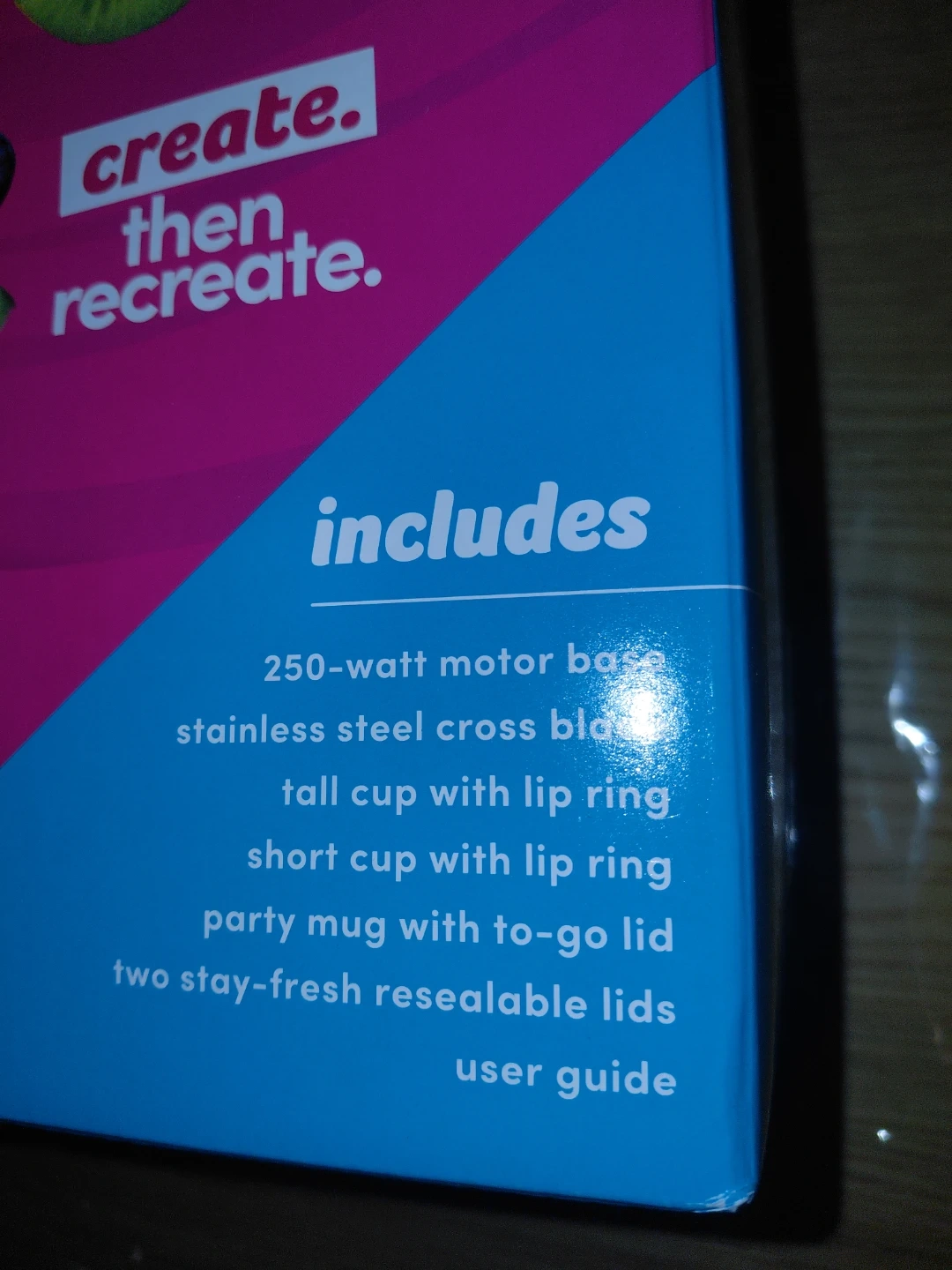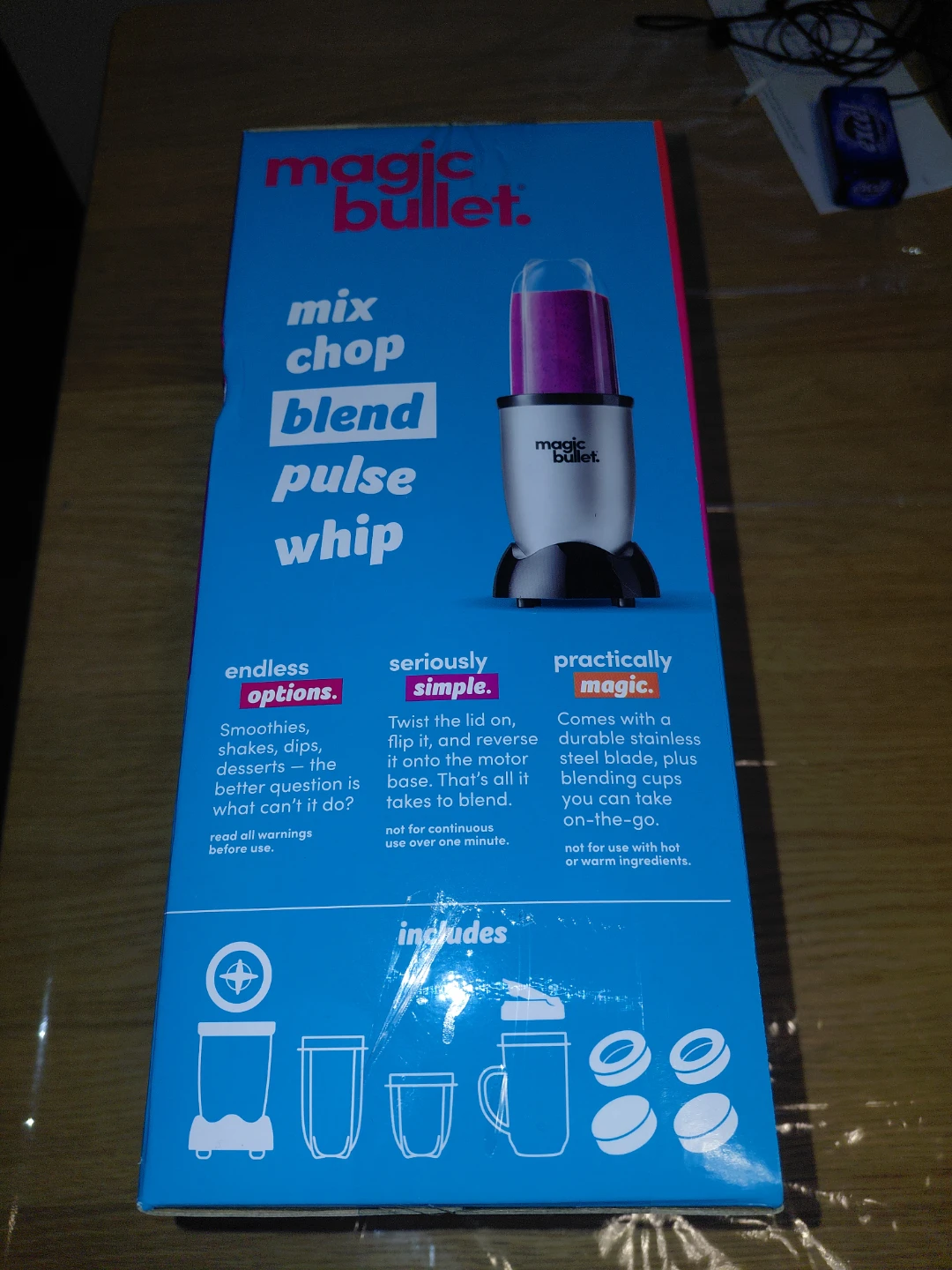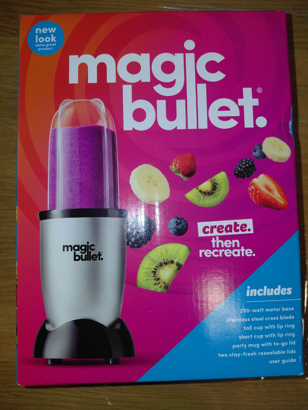 New in box! Magic Bullet blender! It comes with a 250-watt motor base, a stainless steel cross blade, a tall cup with lip ring, a short cup with lip ring, a party mug with to-go lid, two stay-fresh resealable lids, and a user guide. It's perfect for making smoothies, shakes, dips, and desserts