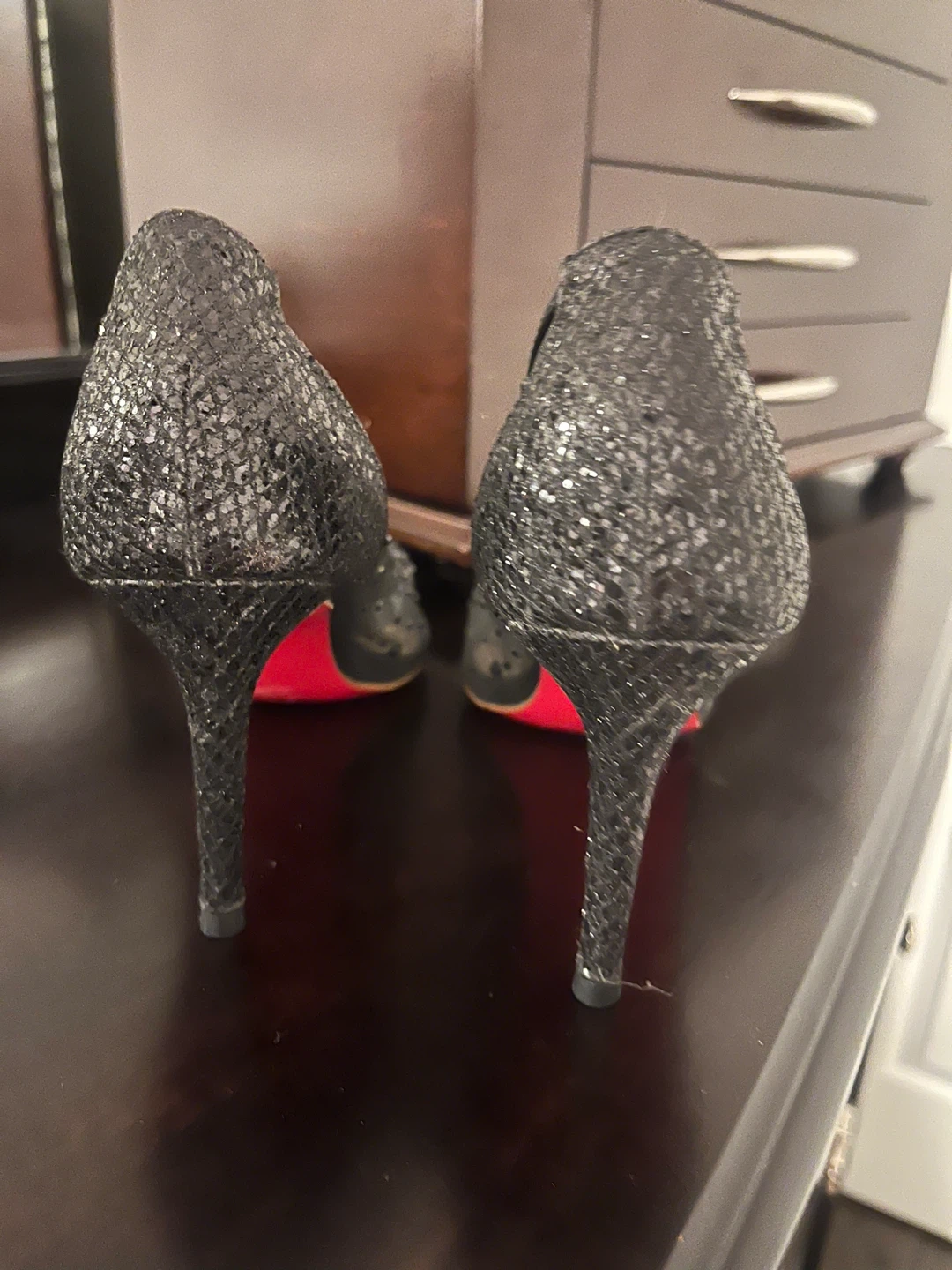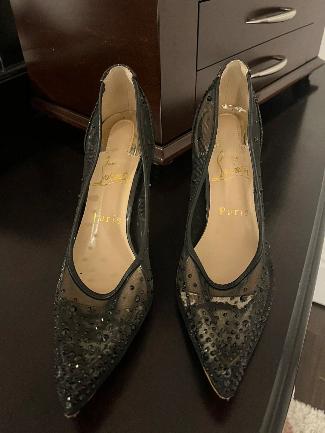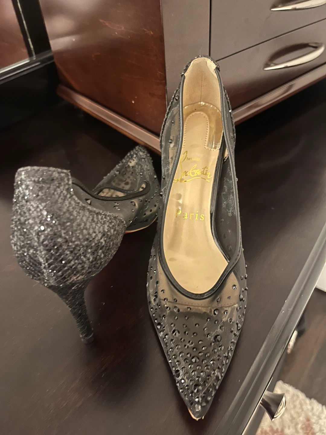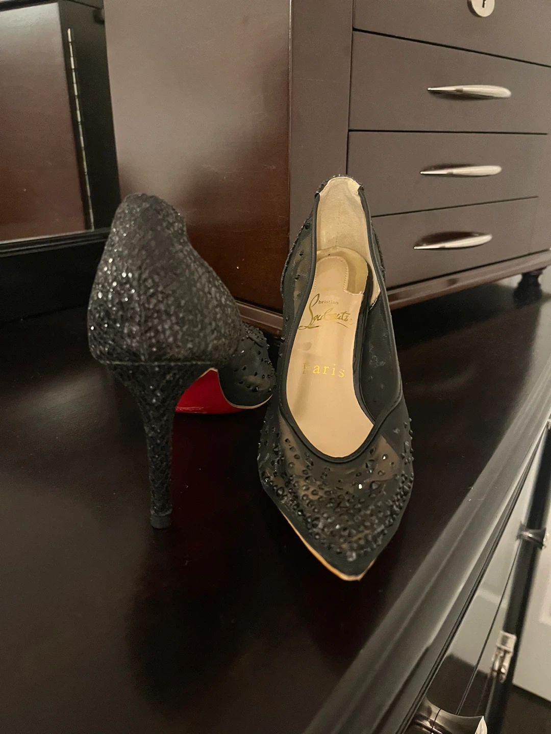 Selling a pair of Christian Louboutin heels! These are black with embellishments and the classic red sole. They are in good condition and ready for a new owner