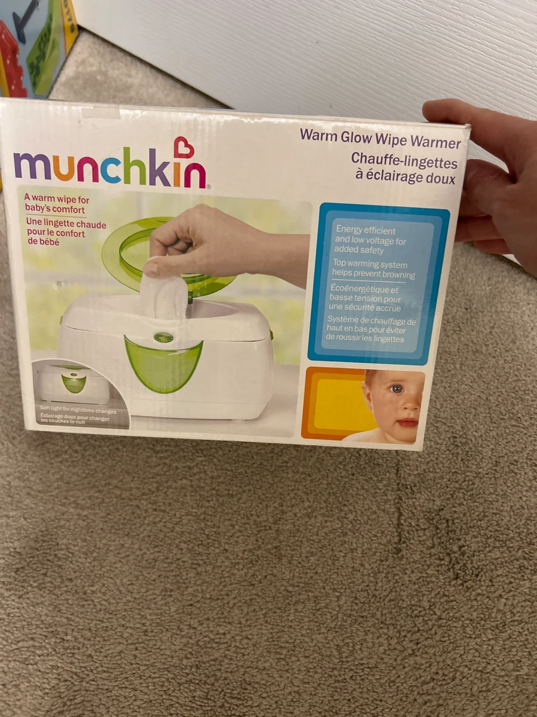 Selling a Munchkin Warm Glow Wipe Warmer, still in its original box! It’s barely used. This warmer is designed to provide a warm wipe for baby's comfort. It features an energy-efficient and low-voltage system for added safety, along with a top warming system to help prevent browning. It also has a soft light for nighttime changes.