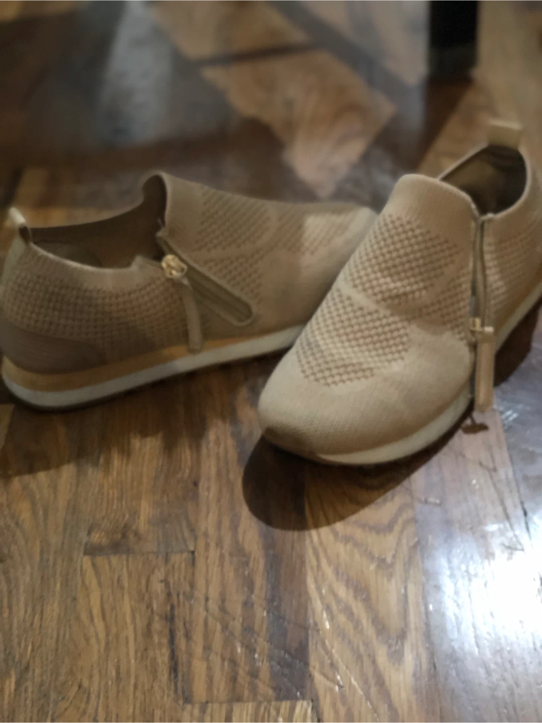 Selling a pair of beige slip-on shoes. They have a zipper detail and a comfortable-looking sole. Perfect for everyday wear!