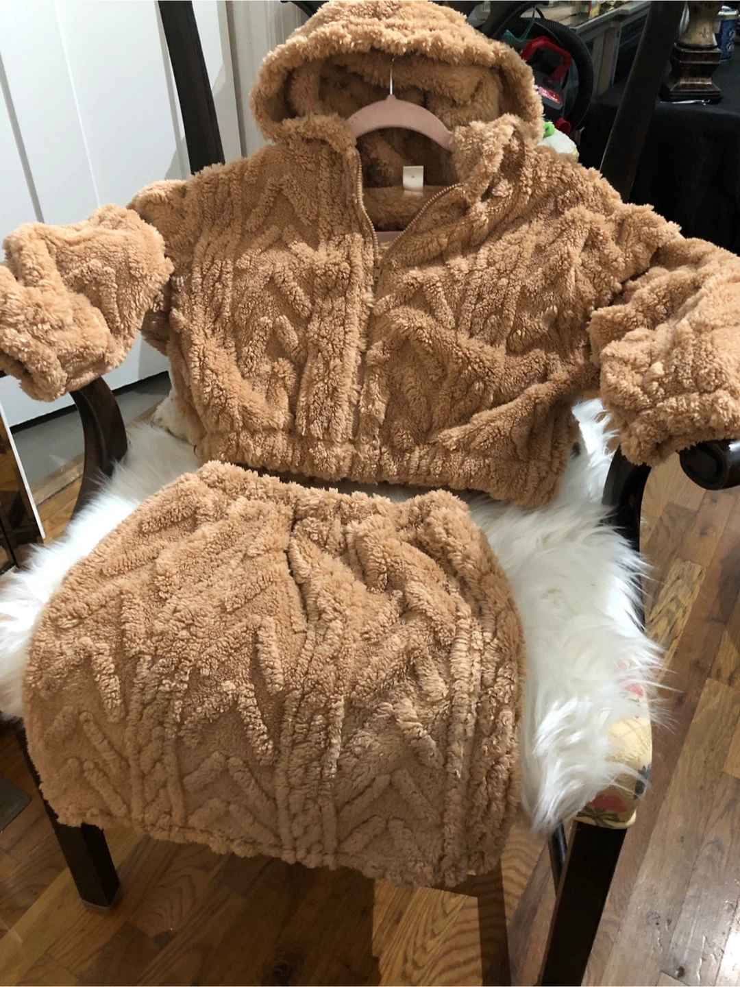 Selling a super cute and cozy fuzzy brown matching set! It includes a hooded zip-up jacket and a skirt. Perfect for lounging around the house or a casual outing. The material is soft and warm, making it ideal for cooler weather