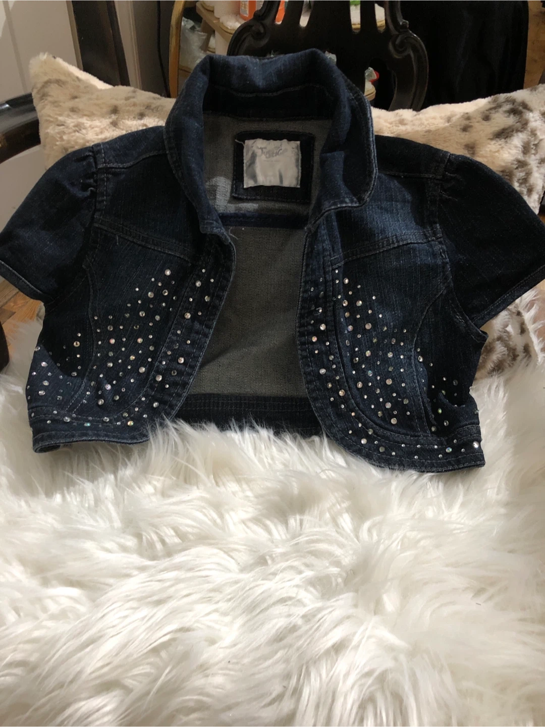 Selling a cute Justice denim bolero jacket. It's a size 10 and features sparkly embellishments. Perfect for layering!