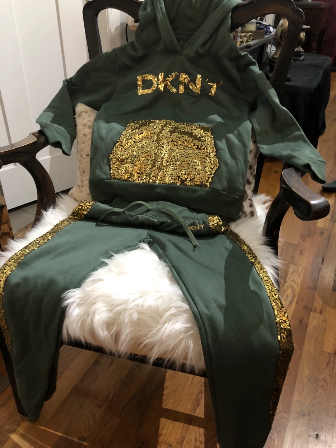 Selling a DKNY kids size 8 tracksuit in green with gold sequins! It includes a hoodie and matching pants. Perfect for adding a bit of sparkle to your wardrobe