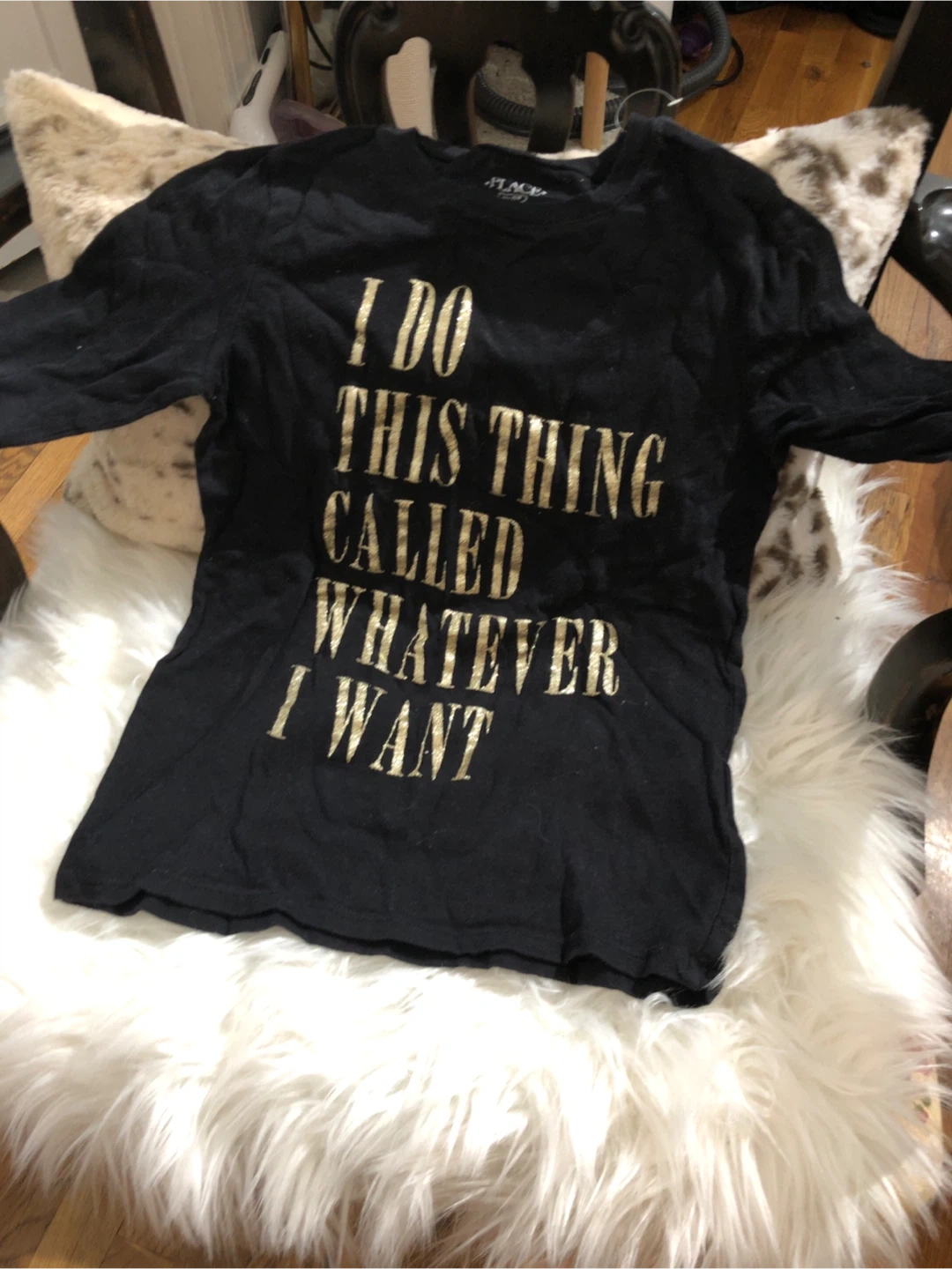 I'm selling a black long-sleeved graphic tee from The Children's Place! Size 8 It features the phrase "I DO THIS THING CALLED WHATEVER I WANT" in gold lettering. Perfect for kids who like to express themselves