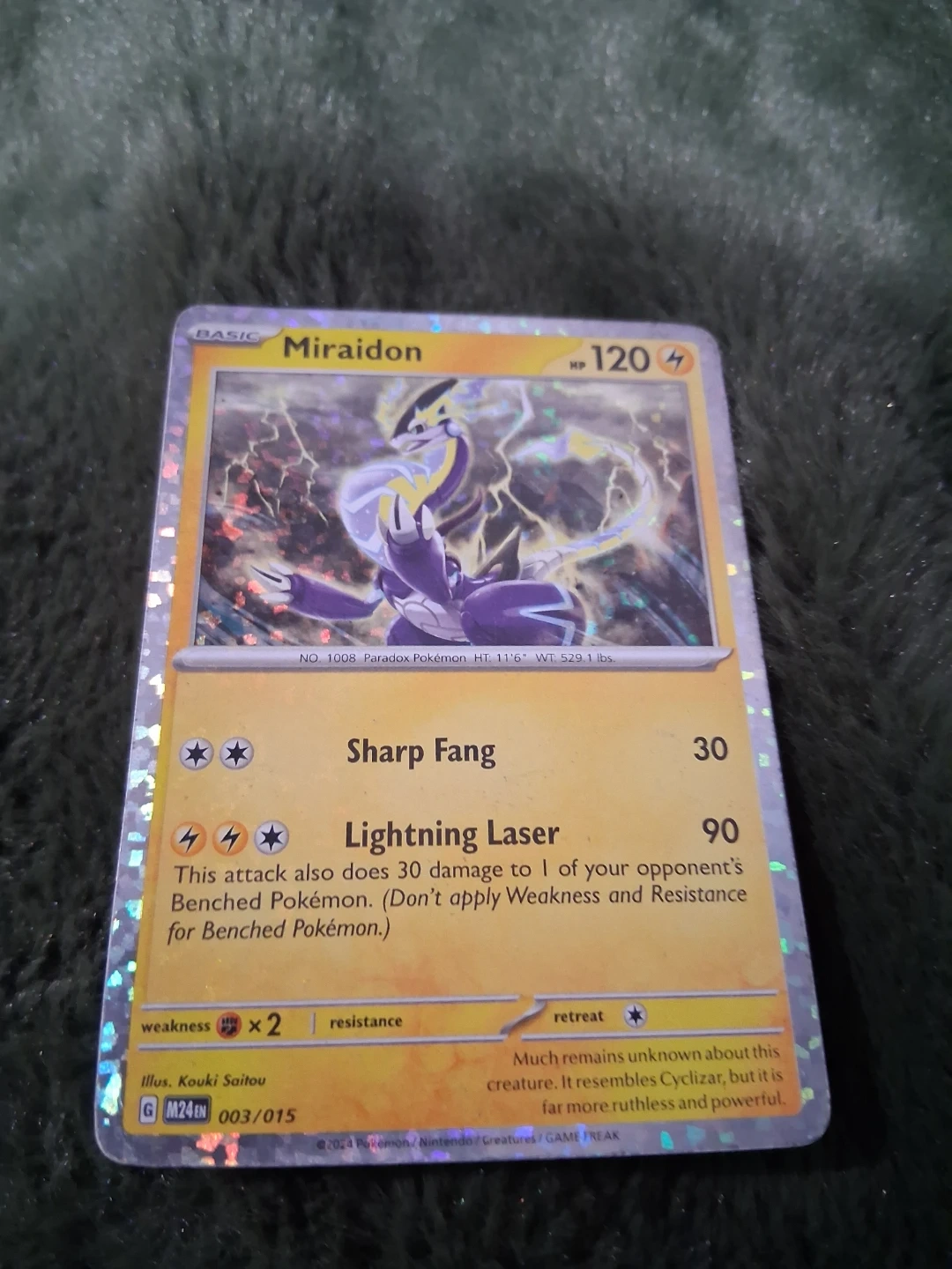 Selling a Miraidon Pokemon card! It has the Sharp Fang and Lightning Laser attacks. It's in great condition and ready for a new trainer its shiny and a bit old.and im selling it for giving my mom a good gift💓