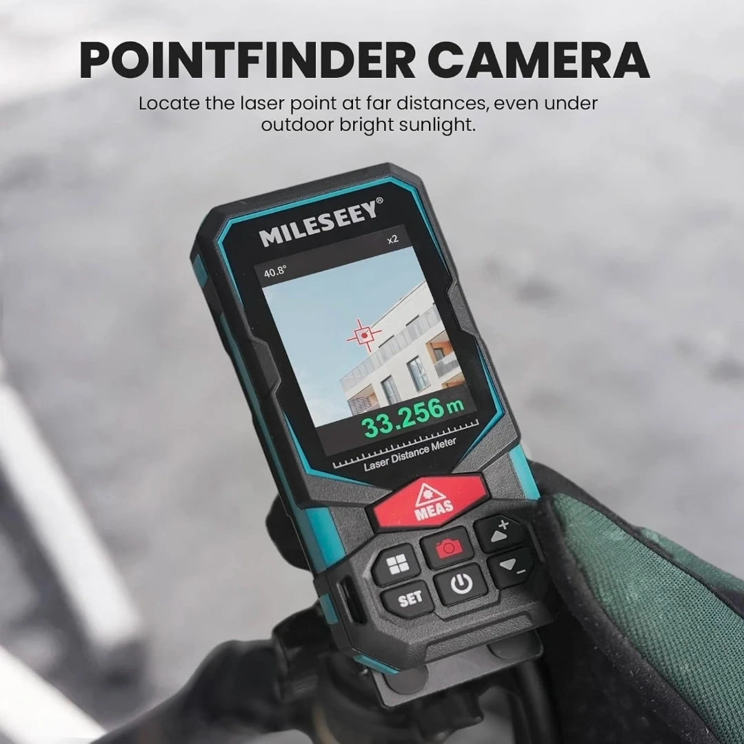 This MILESEEY laser distance meter is great for measuring distances quickly and accurately! It's perfect for home improvement projects or professional use. The Pointfinder camera helps you locate the laser point even in bright sunlight. It also features P2P technology for measuring distances between two points.