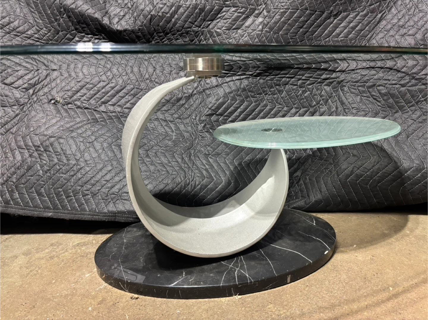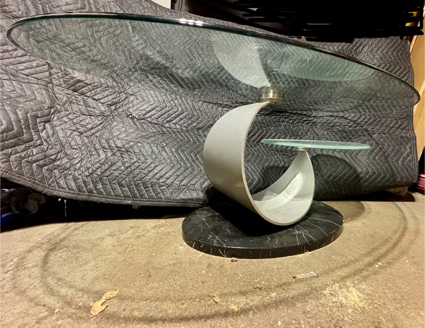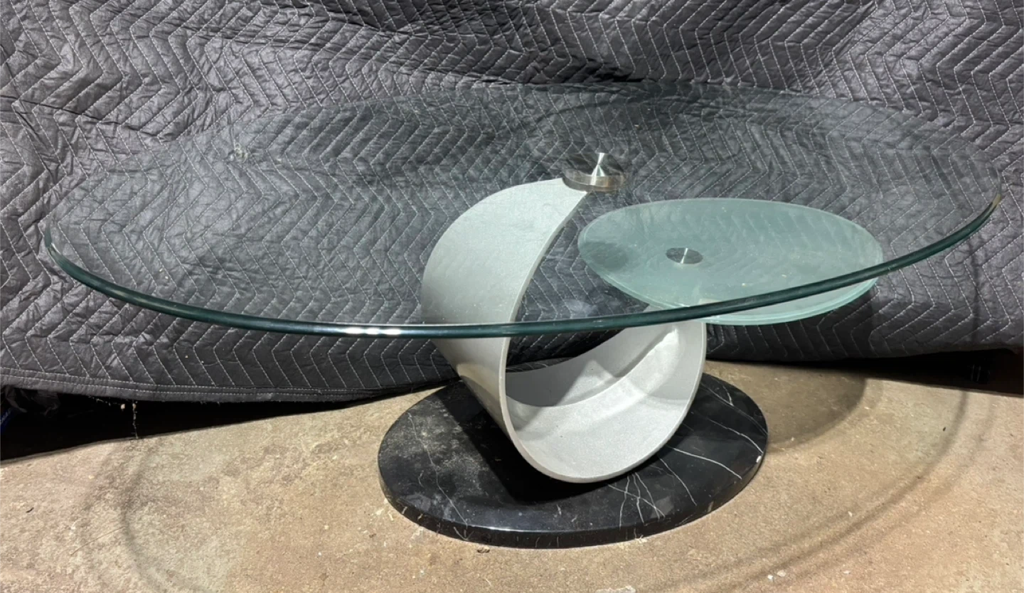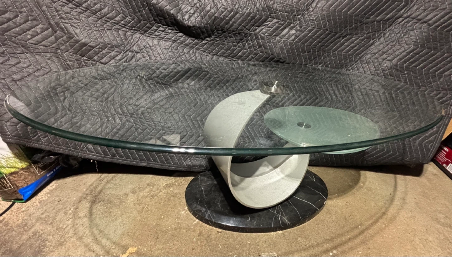 Selling a stylish coffee table featuring a glass top and a sleek marble base. The design includes a unique, curved support structure. Perfect for adding a touch of modern elegance to your living room!