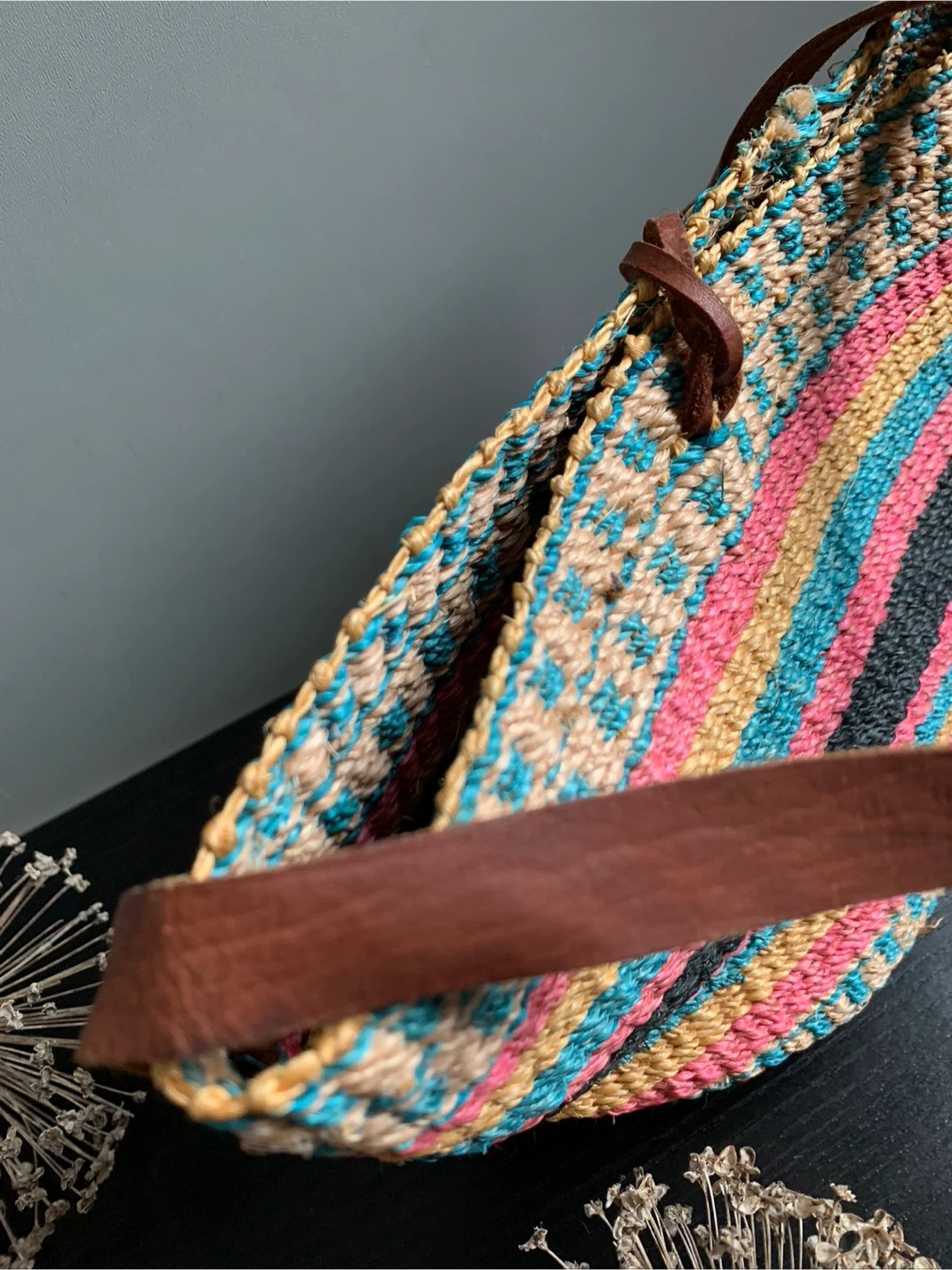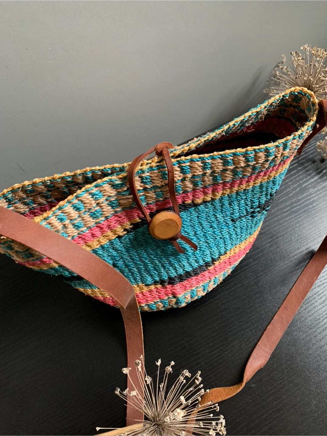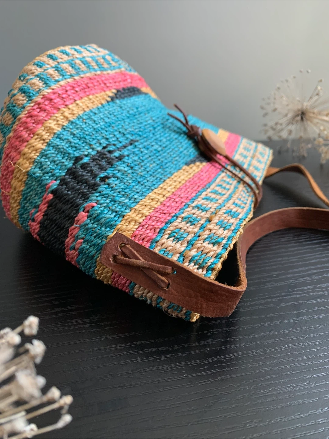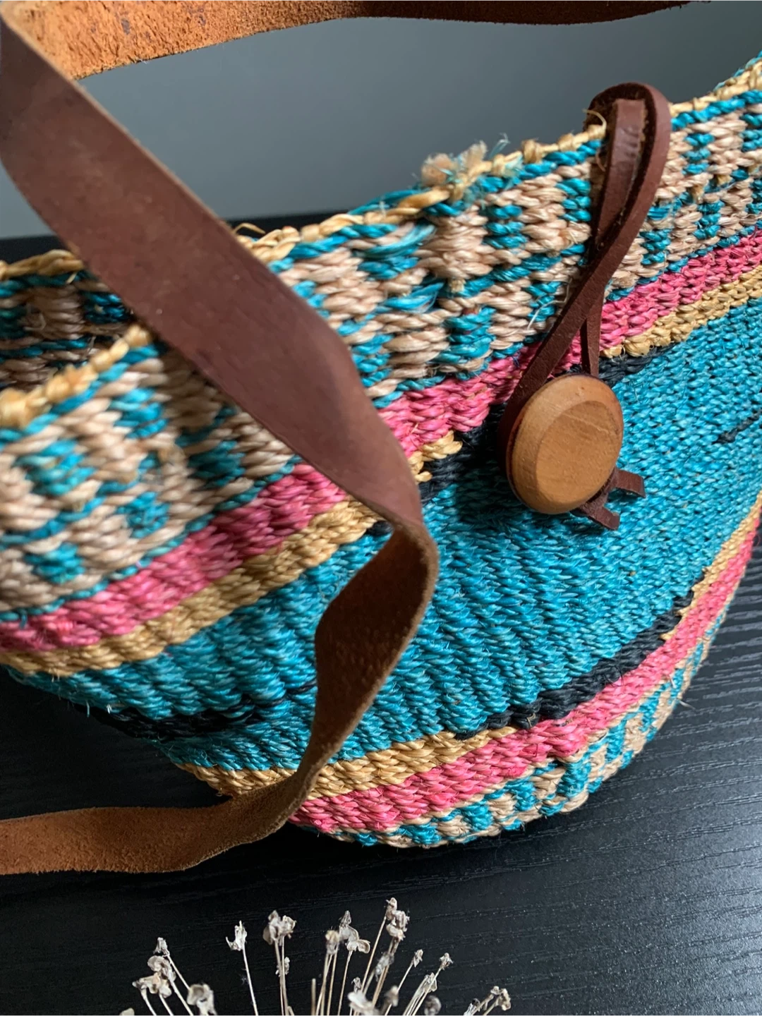 •The bag also has brown leather straps and a wooden button detail adding a touch of rustic charm.