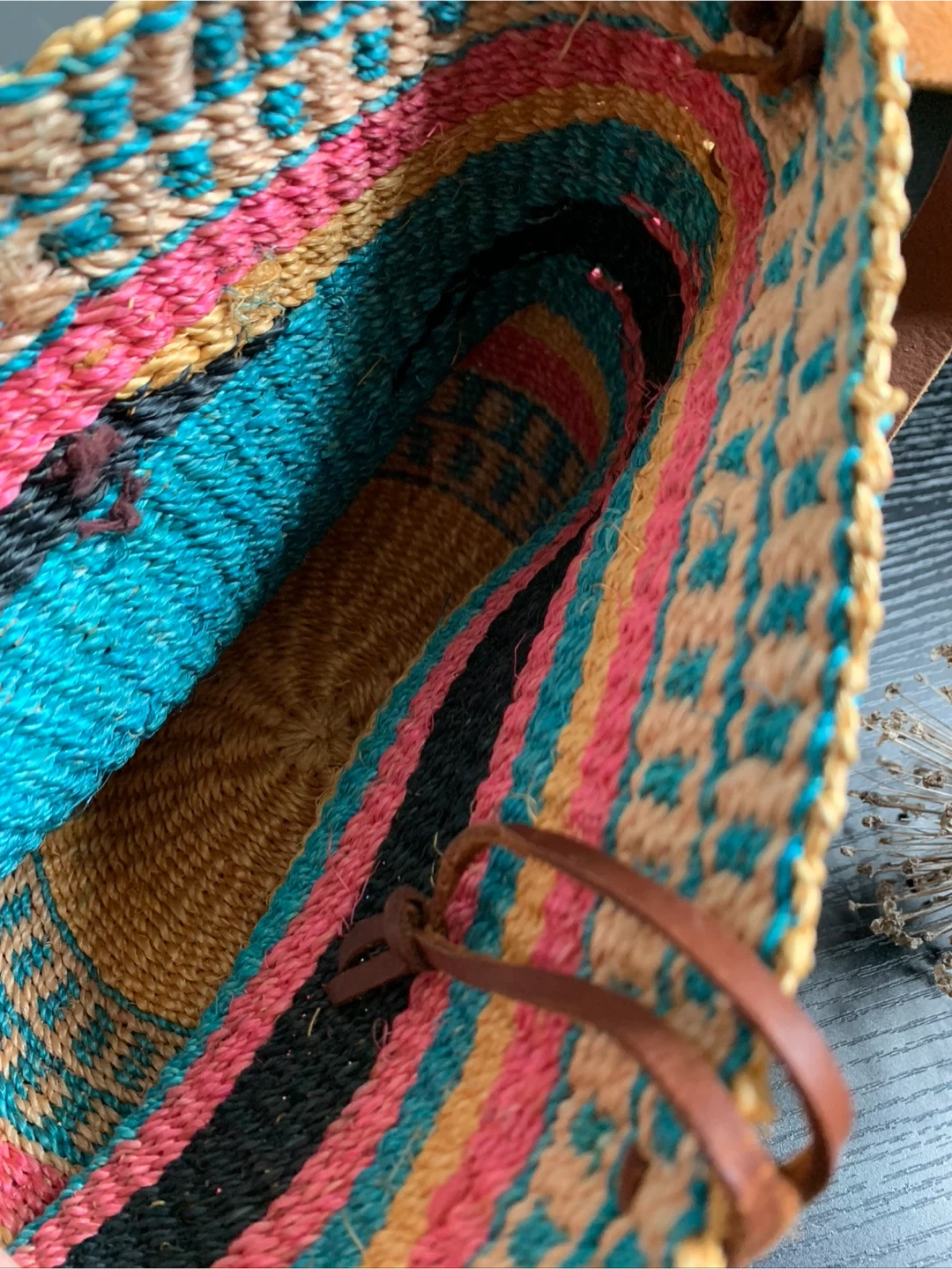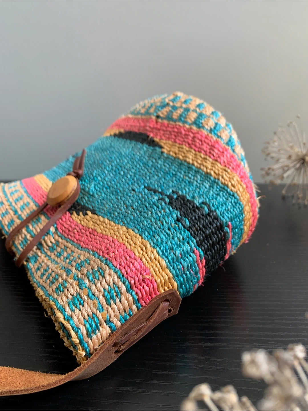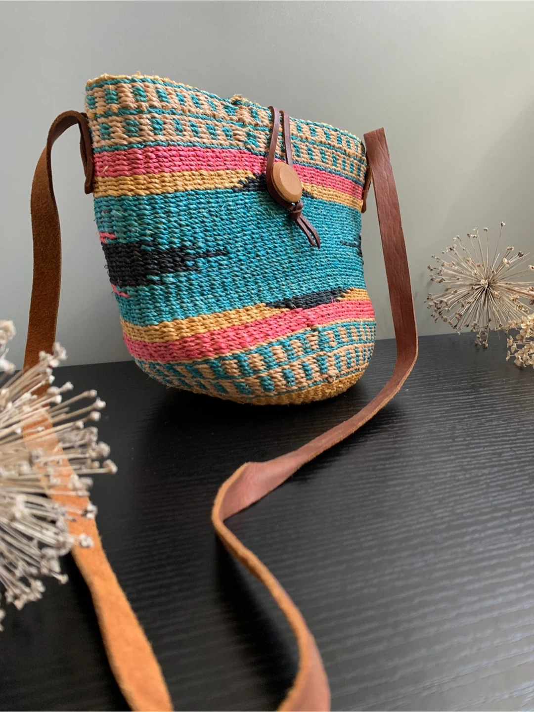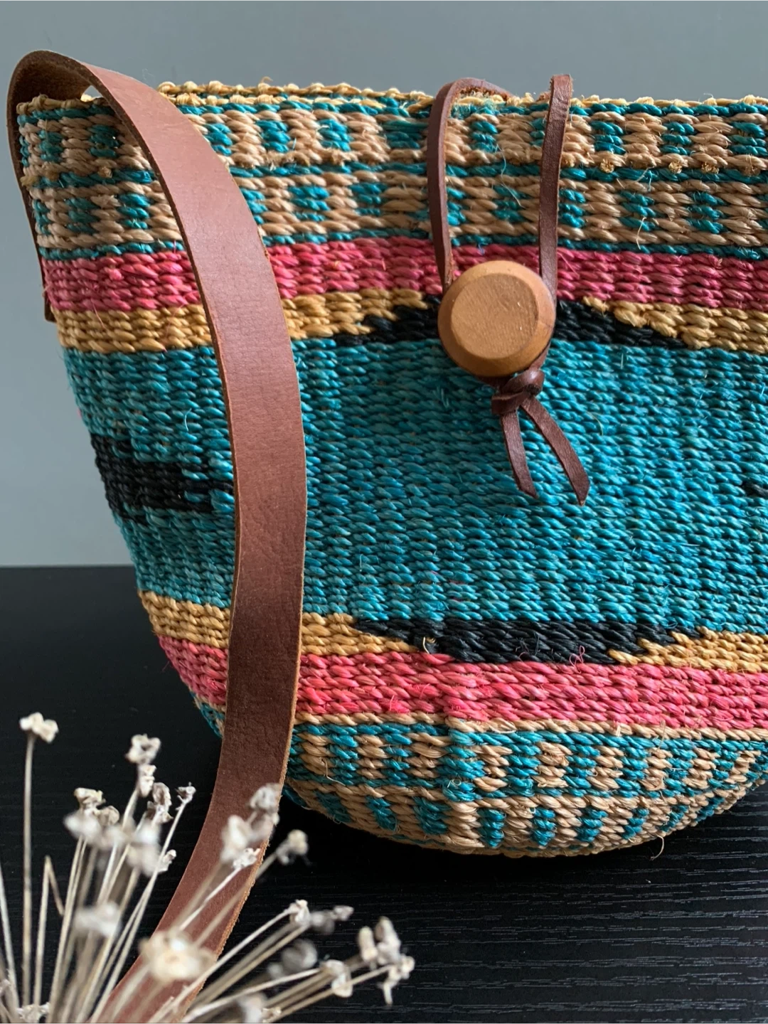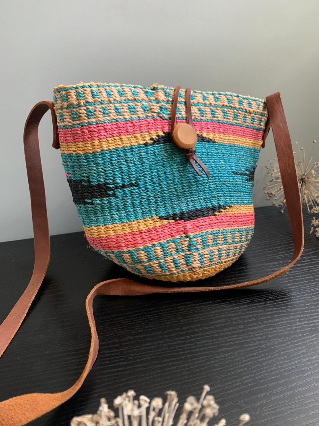 •The bag also has brown leather straps and a wooden button detail adding a touch of rustic charm.