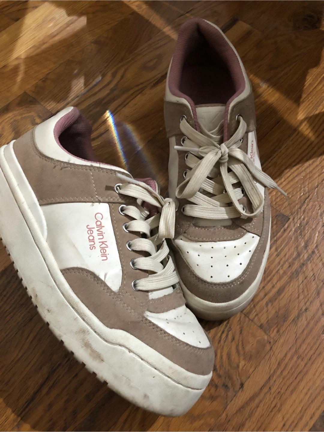 Selling a pair of Calvin Klein Jeans sneakers. They are a light brown and white color. They show some signs of wear.
