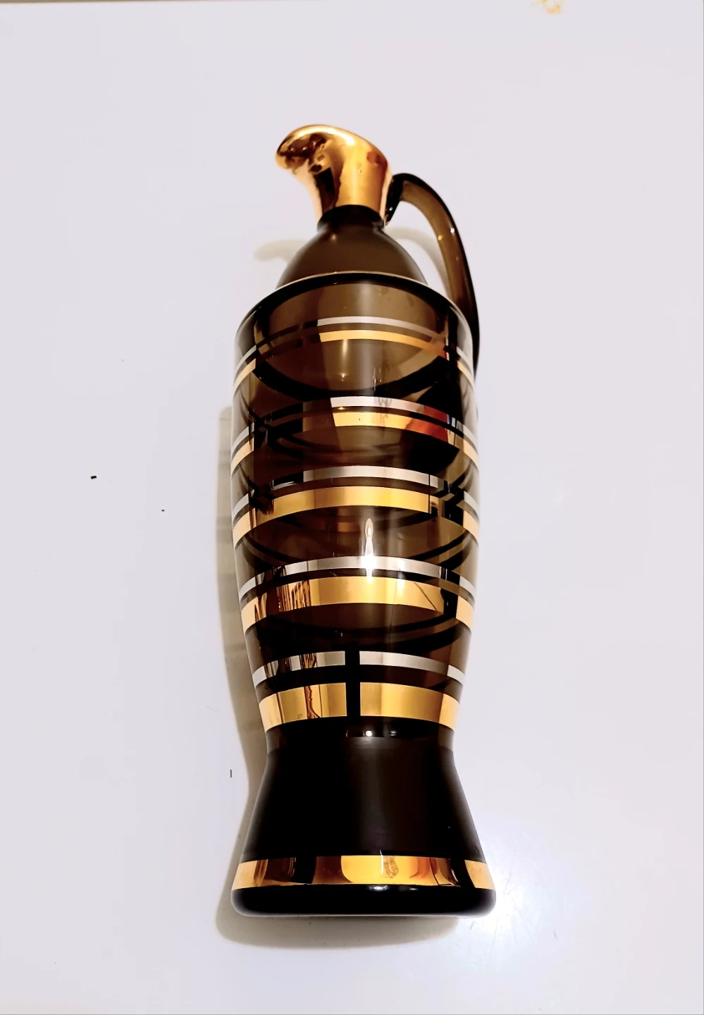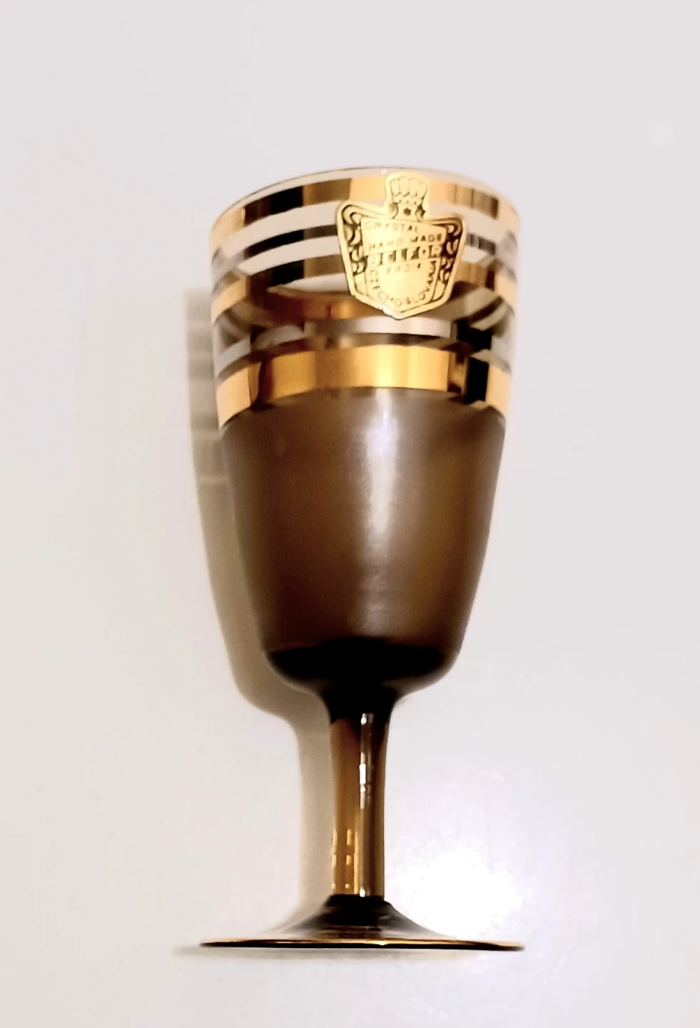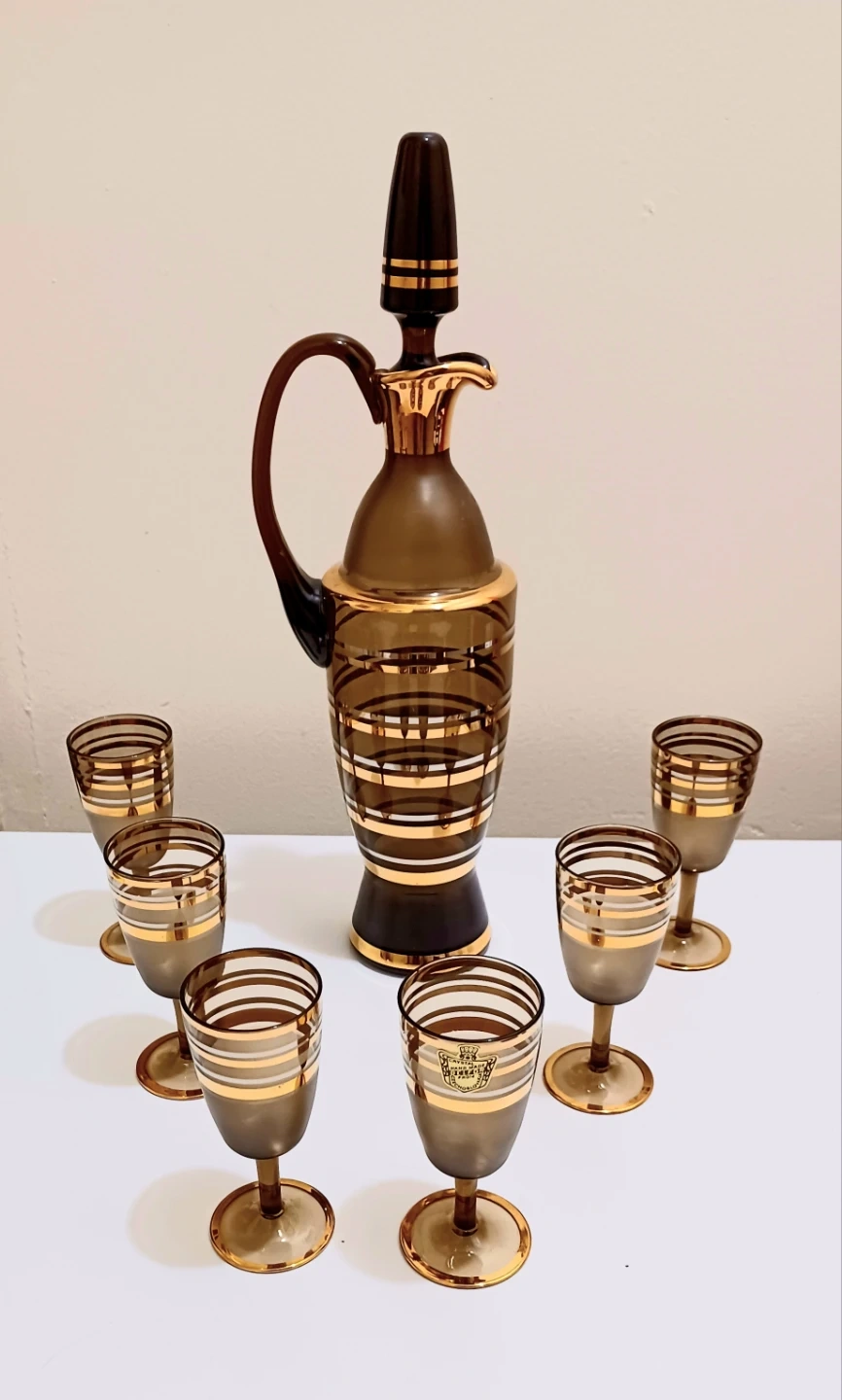 Unique, Stunning, vintage Bohemian Belfor Crystal decanter set, handmade with stunning detail, including a decanter and six glasses, each adorned with gold accents, making it a sophisticated addition to any home bar. As a used item, it holds a unique charm and character.