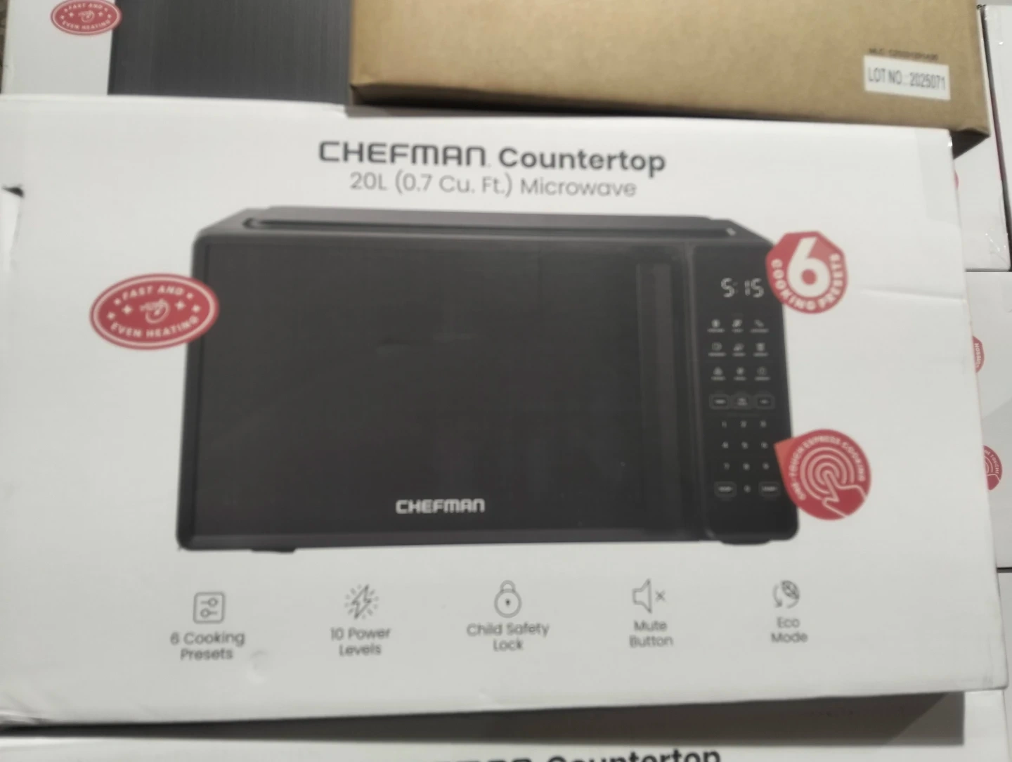 I'm selling a Chefman Countertop 20L (0.7 Cu. Ft.) Microwave. It has fast and even heating, 6 cooking presets, 10 power levels, child safety lock, mute button, and eco mode. The interior is easy to clean, and the glass turntable is dishwasher safe. It's Brand New in Box