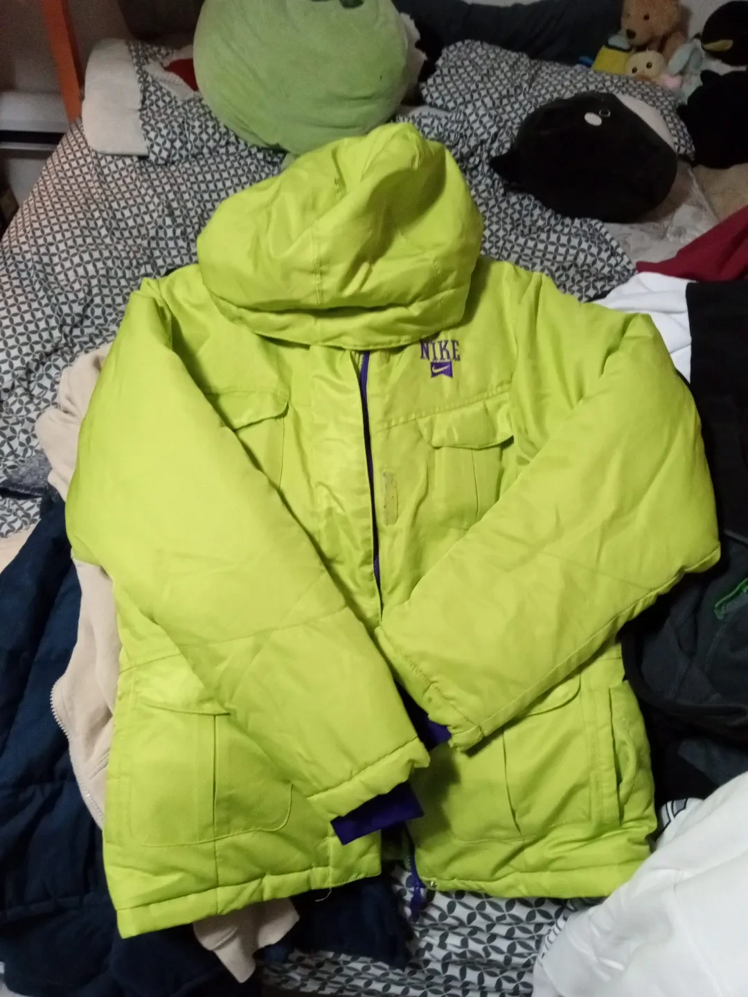 Selling a Nike jacket in a bright green colour! It has a hood and a purple zipper. It's in great condition and ready for a new owner!