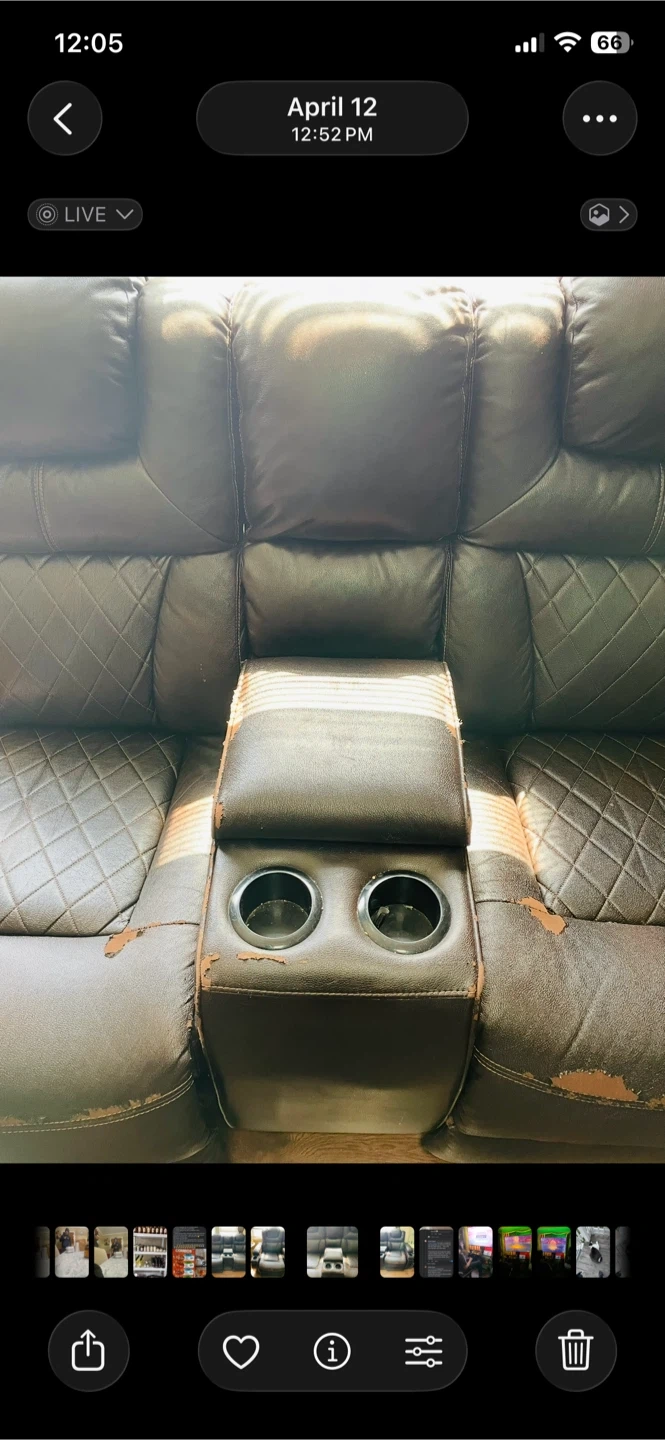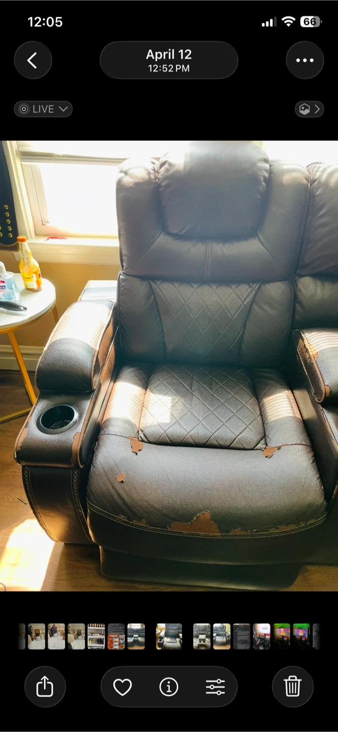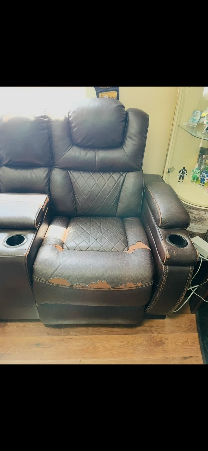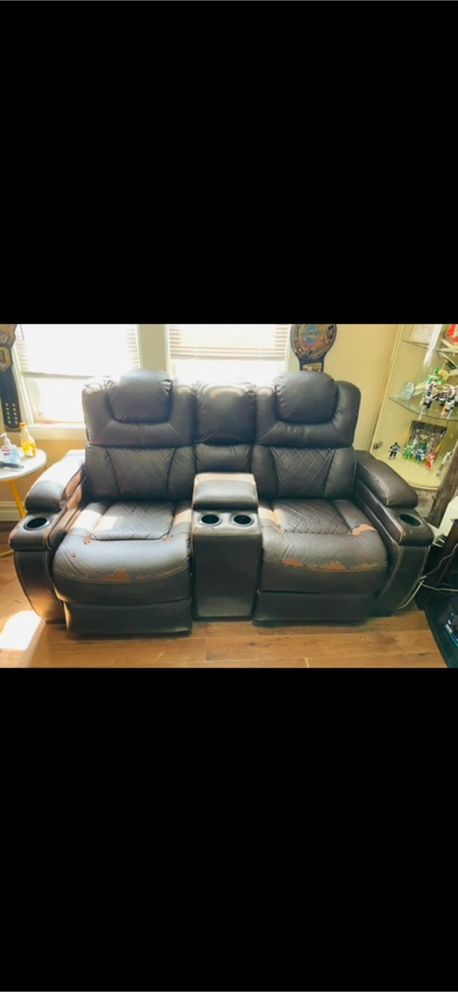 2 seater leather electrical recliners in good overall condition. They have some peeling in areas as shown in photos and middle compartment opens up for storage. Tops of recliners do come off for easier transport.